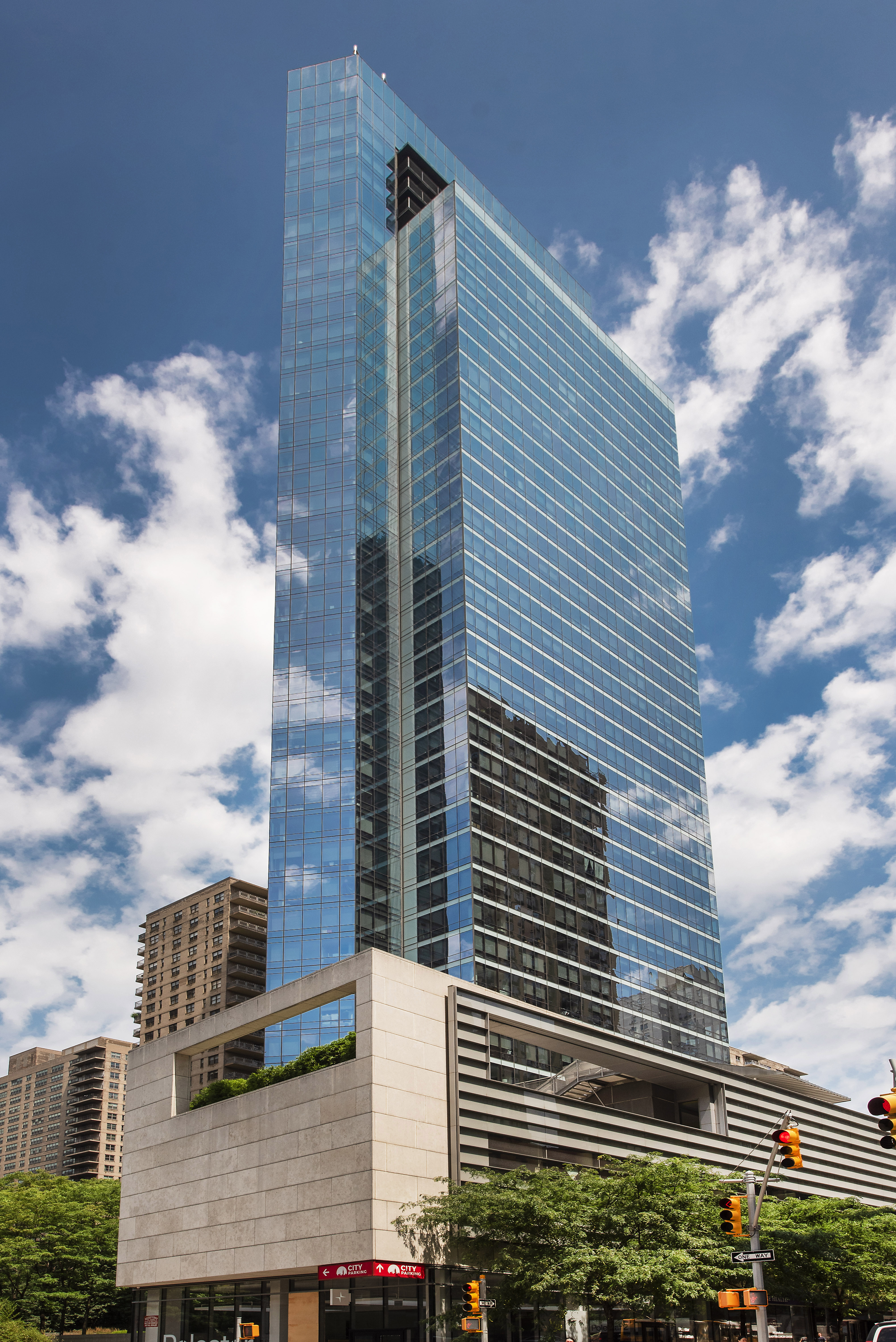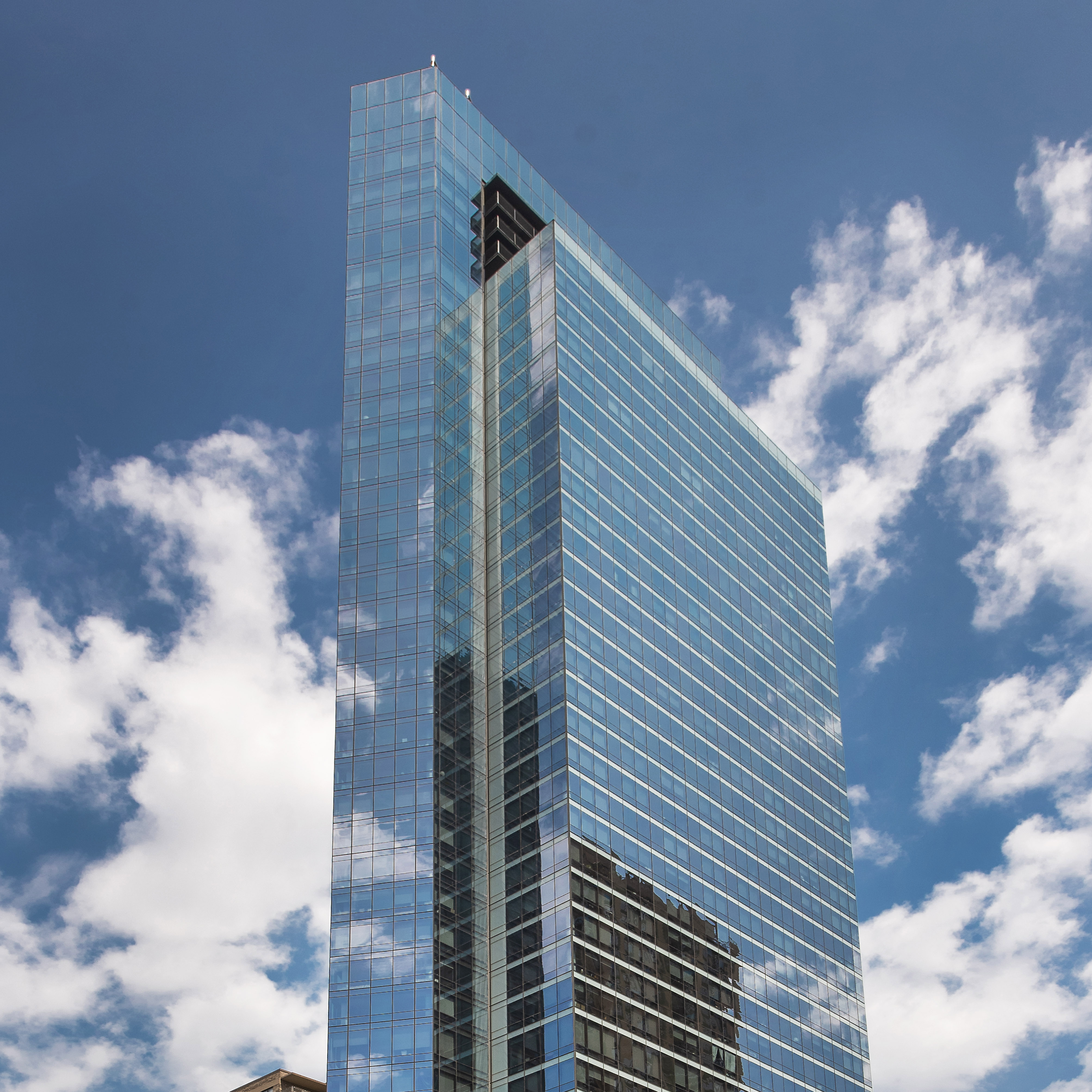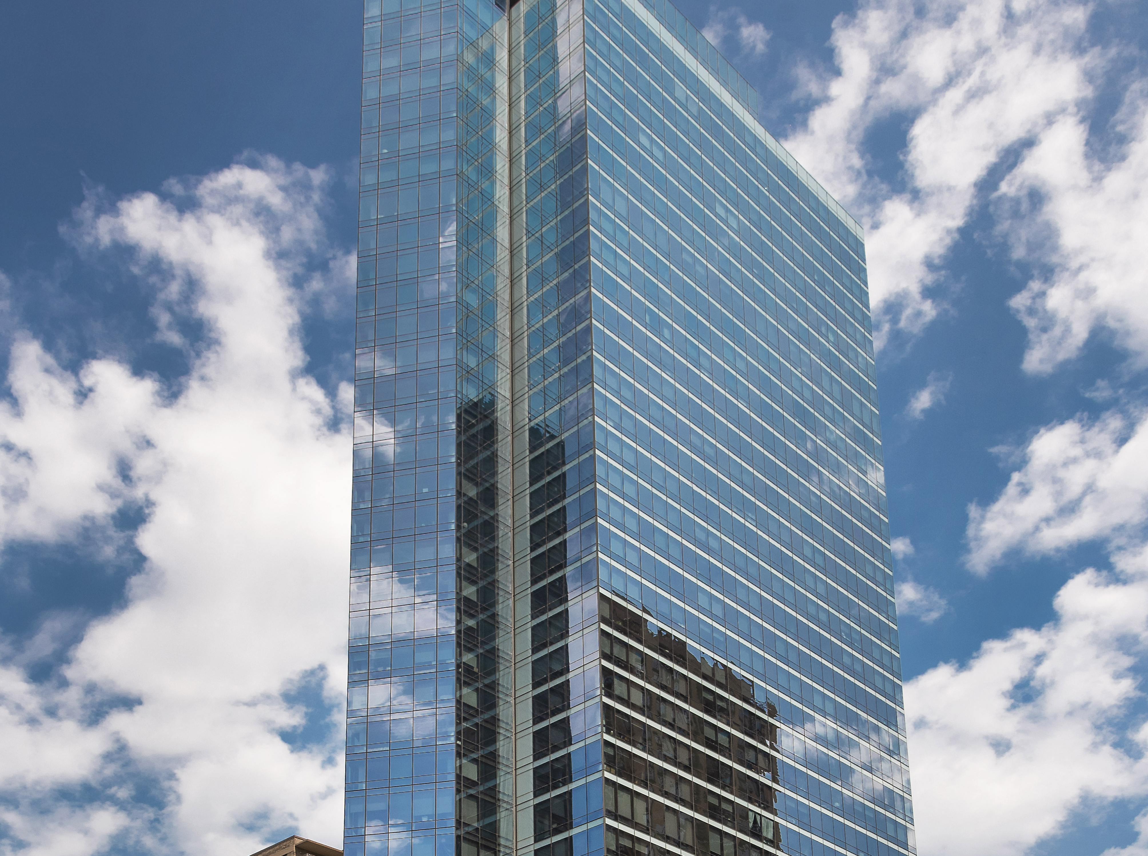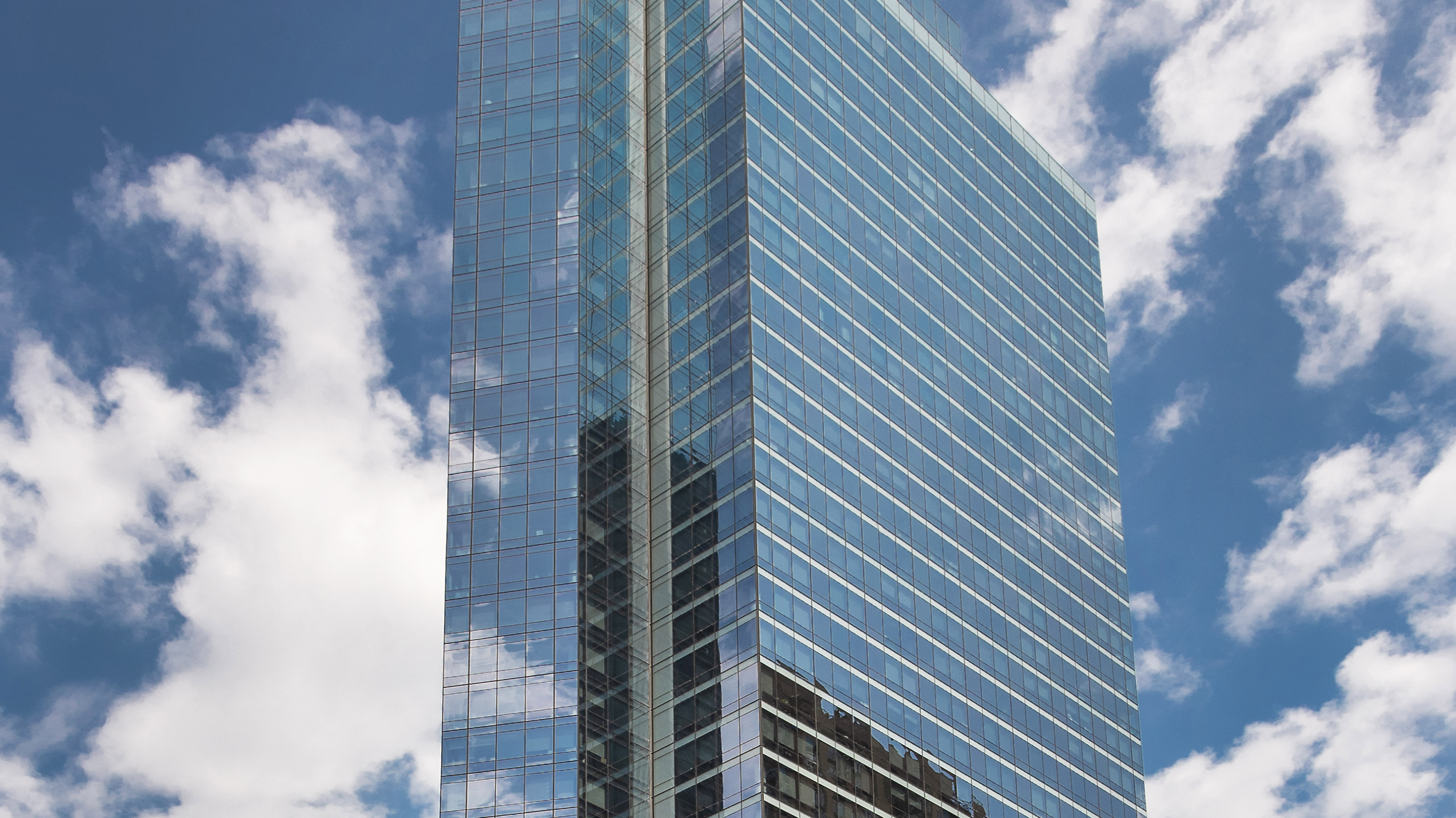 Modern glass skyscraper facade with extensive glazing, steel framing, base structure, and adjacent buildings in urban setting.