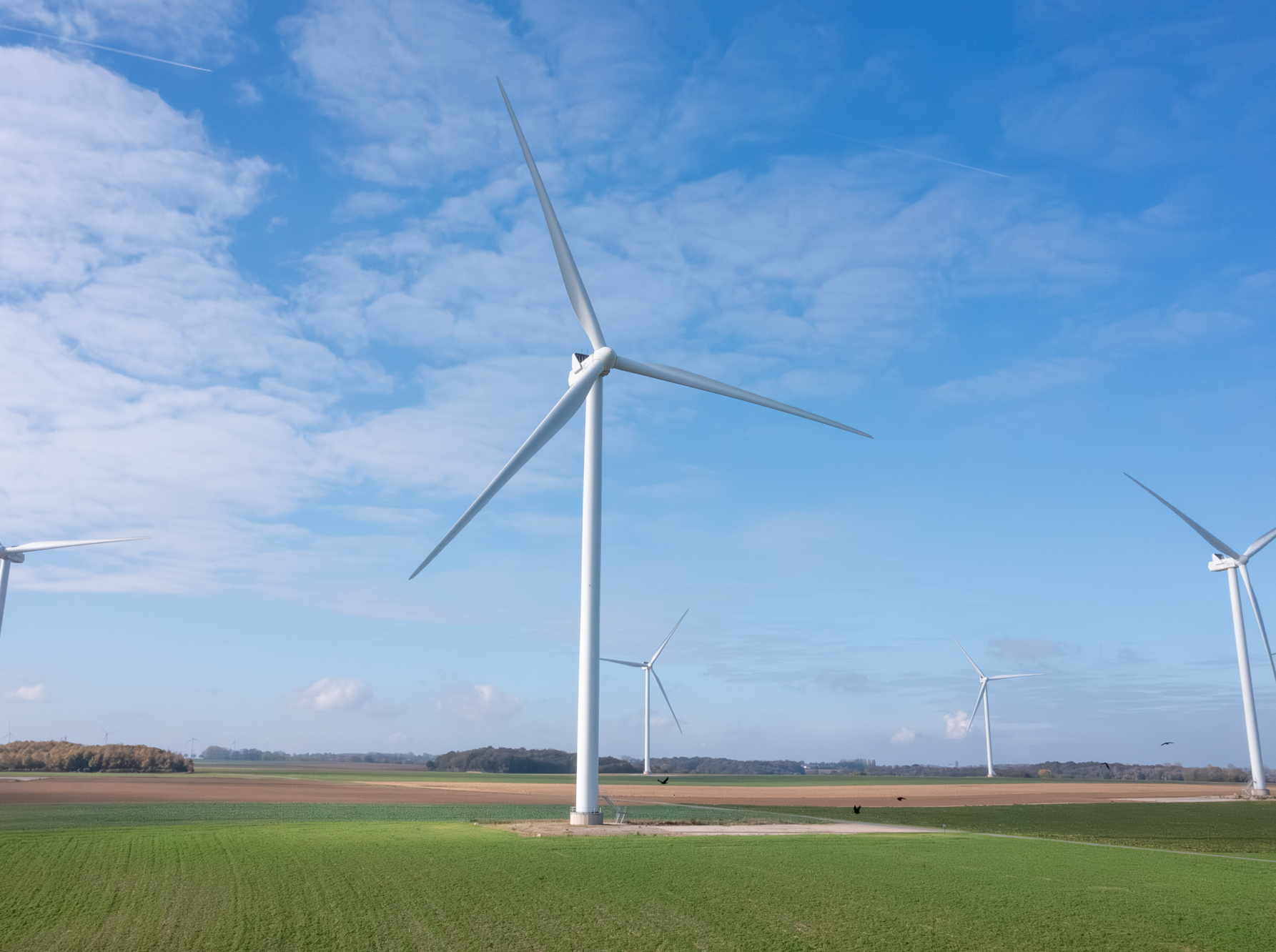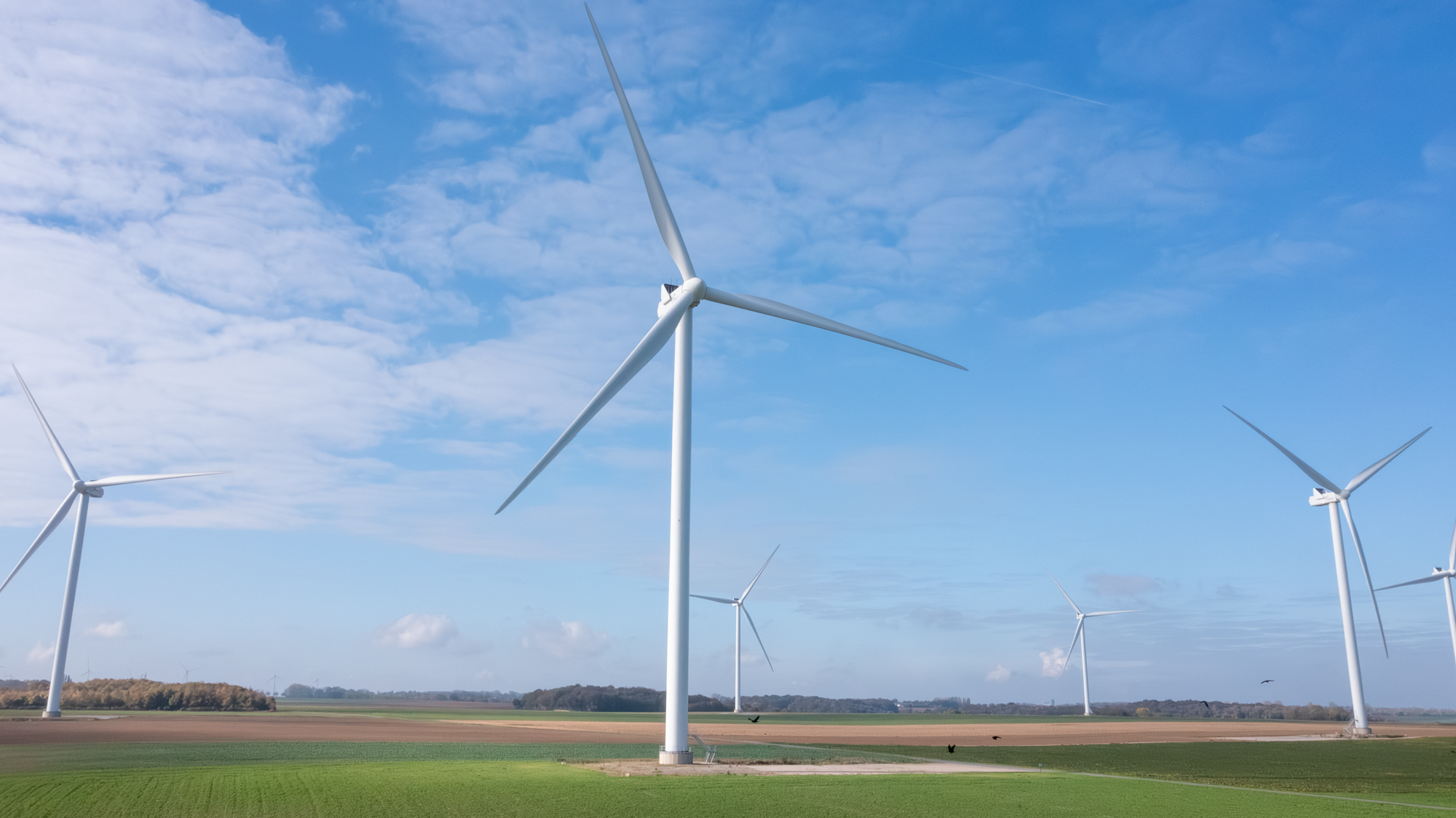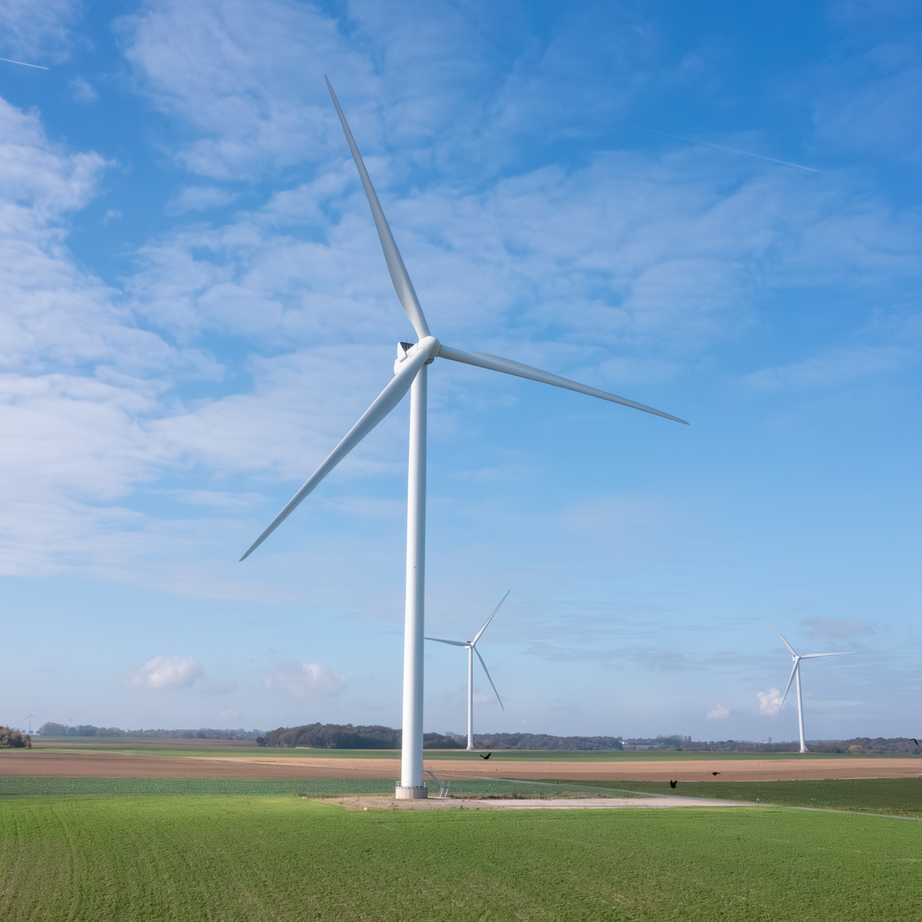Wind farm des Bleuets, located in Saint-Aubin-Montenoy (80), against a backdrop of blue sky and agricultural fields.