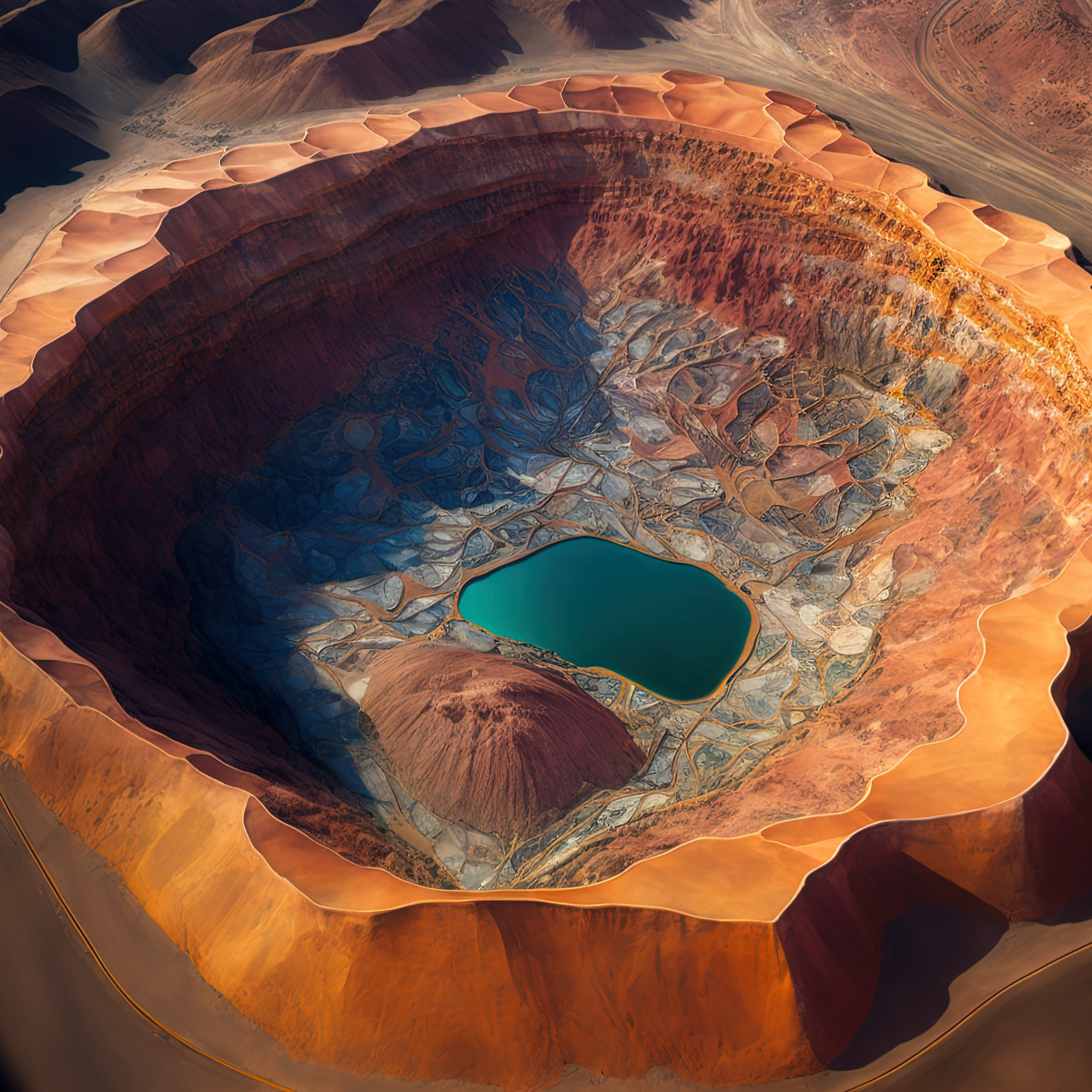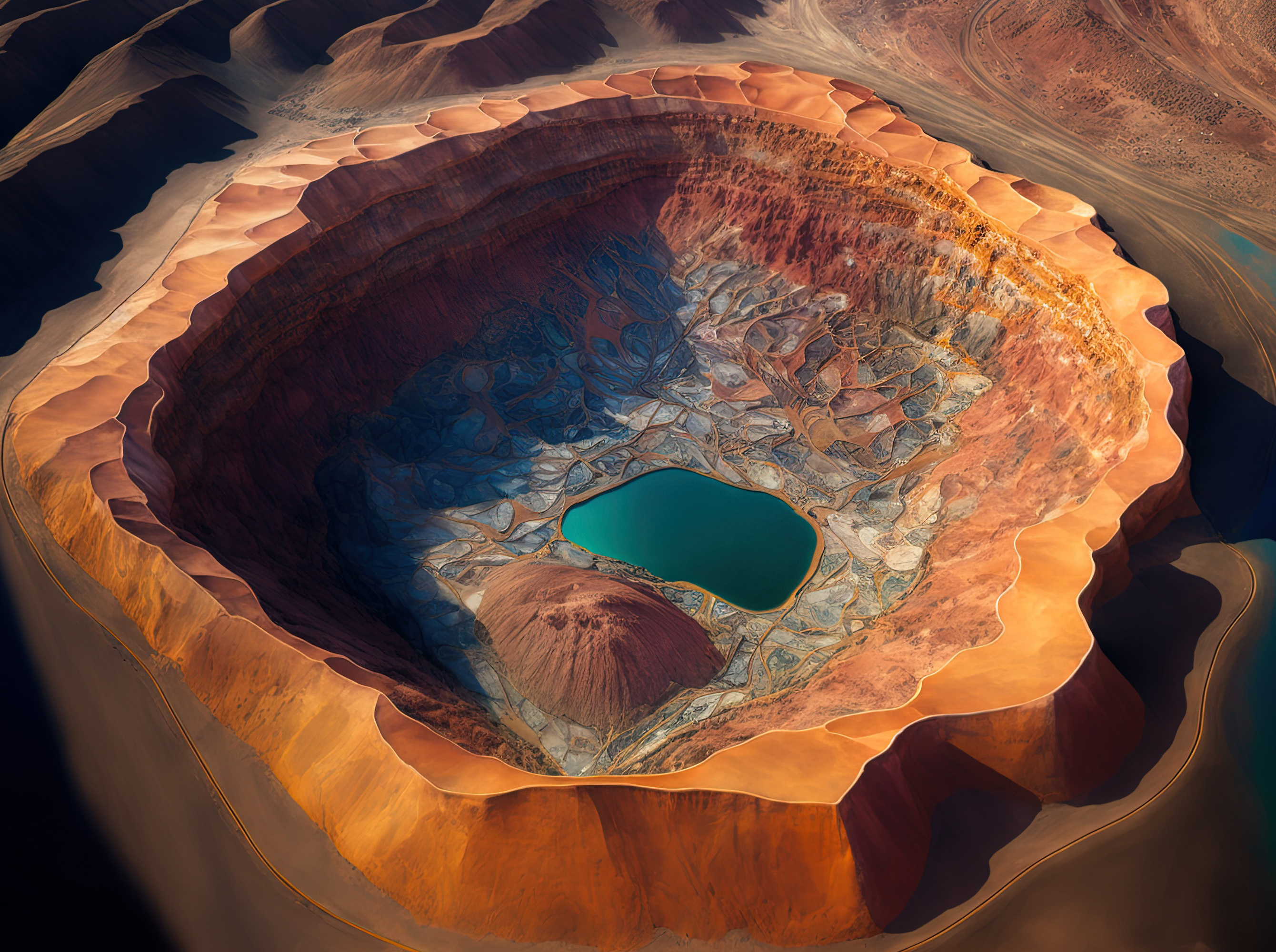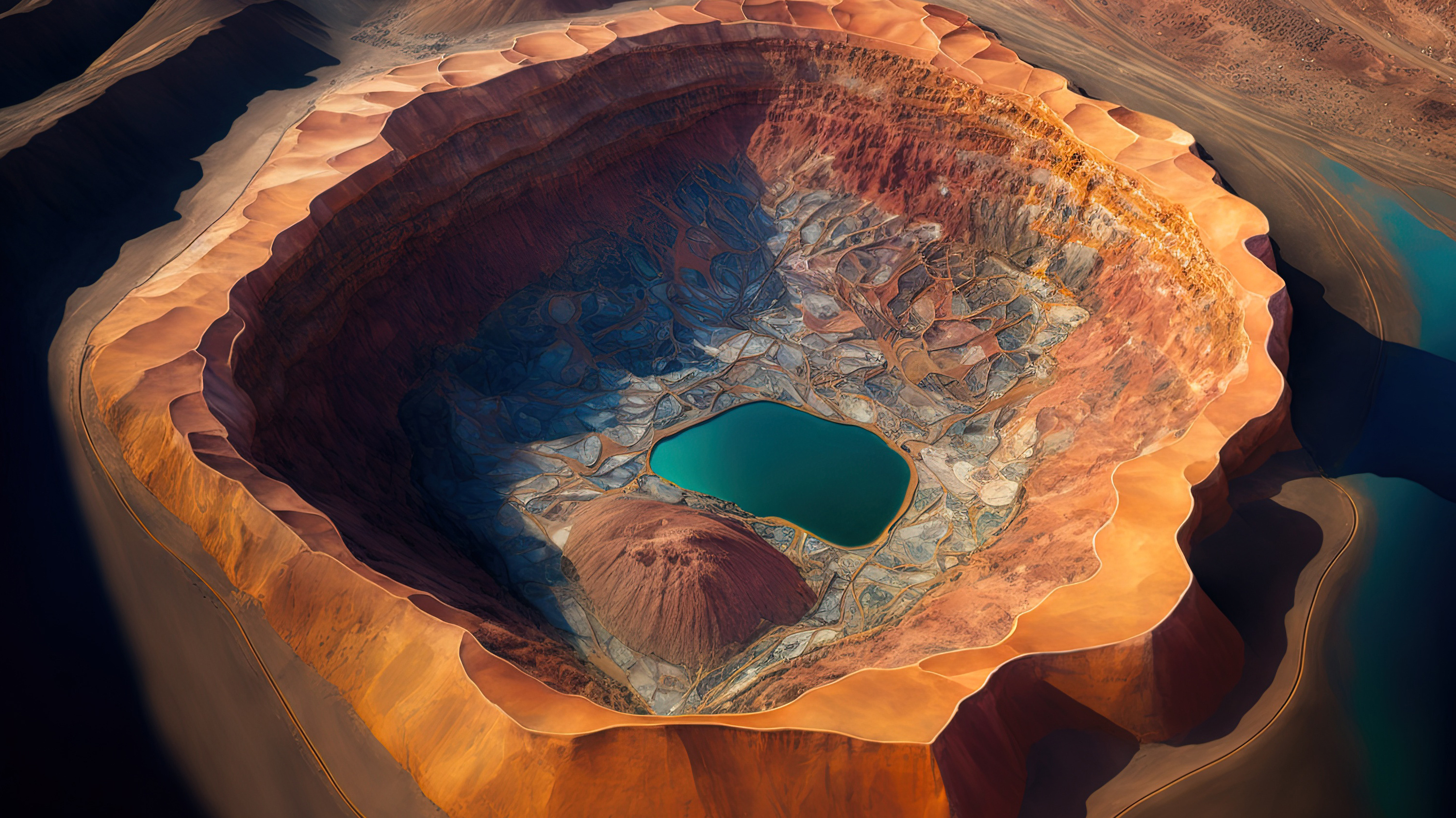 Aerial view of vast open-pit copper mine with turquoise pit lake amid red rocky terrain in northern Chile.