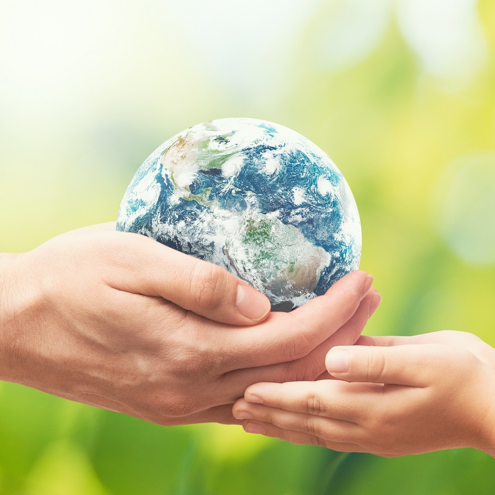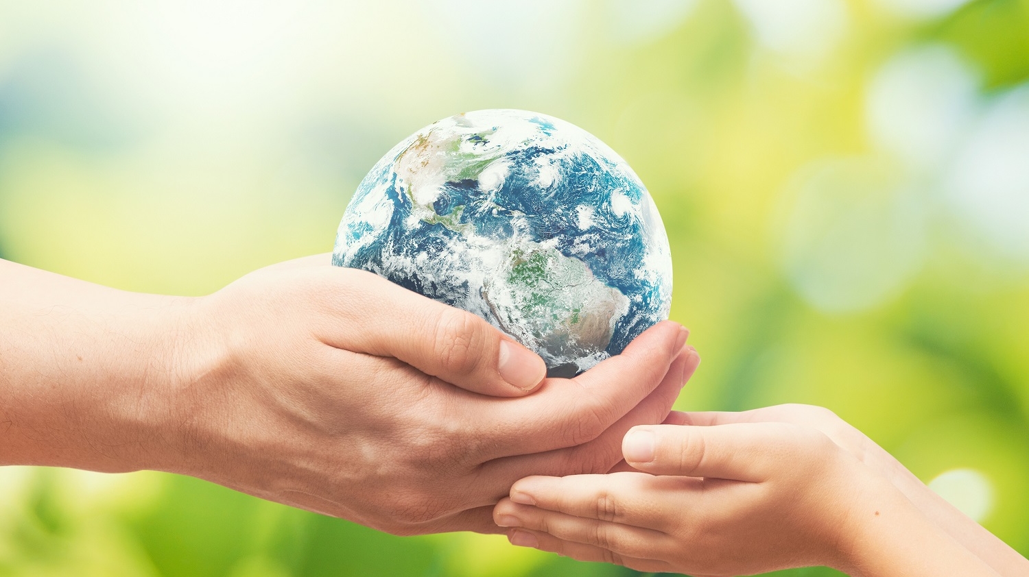 Adult and child hands holding a small Earth globe, symbolizing environmental protection, responsibility and sustainable future.