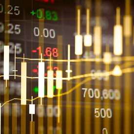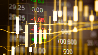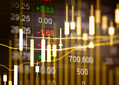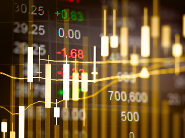 A close-up view of a digital financial trading chart displaying candlestick patterns, numerical data, and moving averages commonly used for stock market analysis.