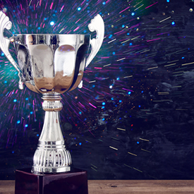 Silver trophy cup with ornate handles displayed on a wooden surface, with colorful celebratory lights in the background, illustrating success and achievement in a business or finance context.