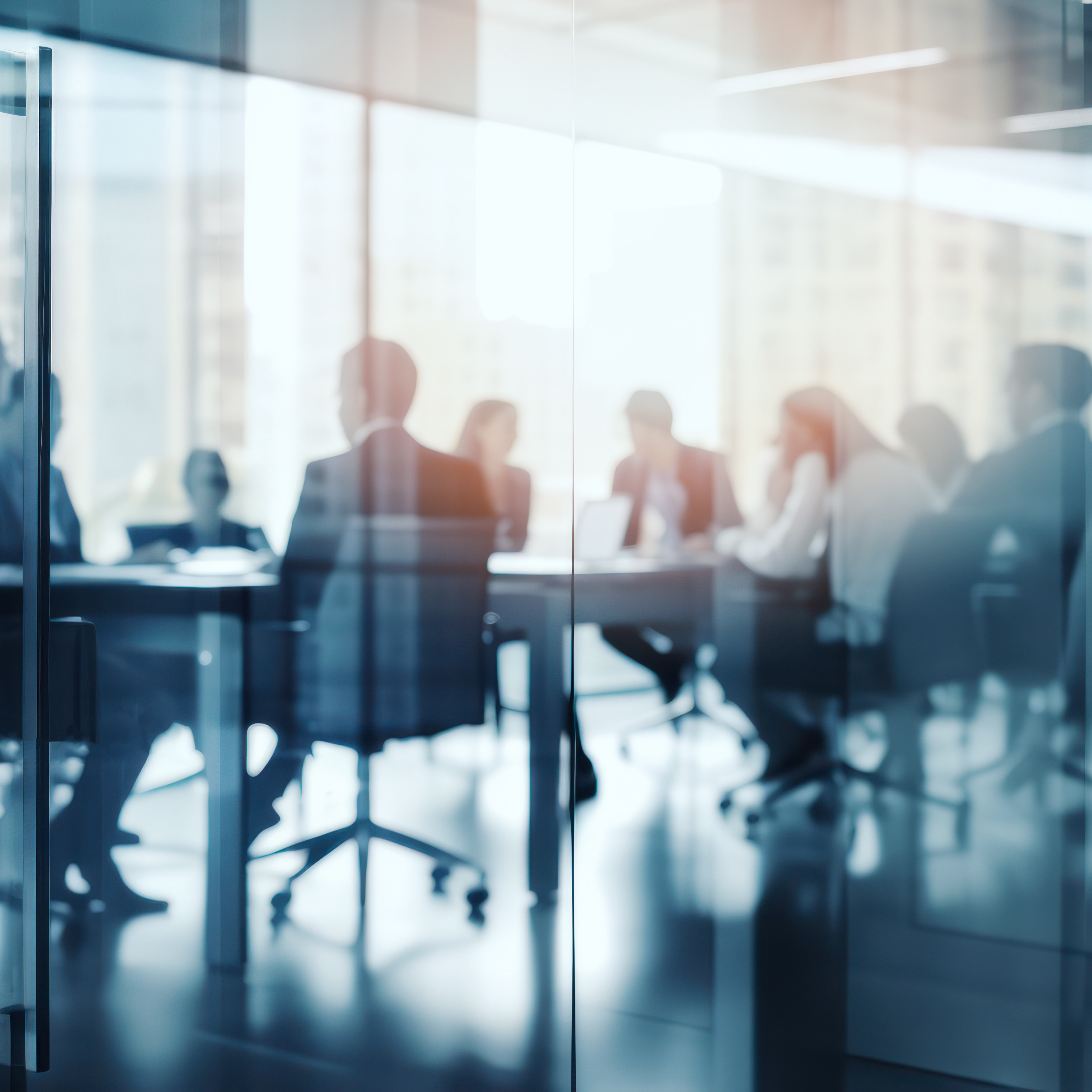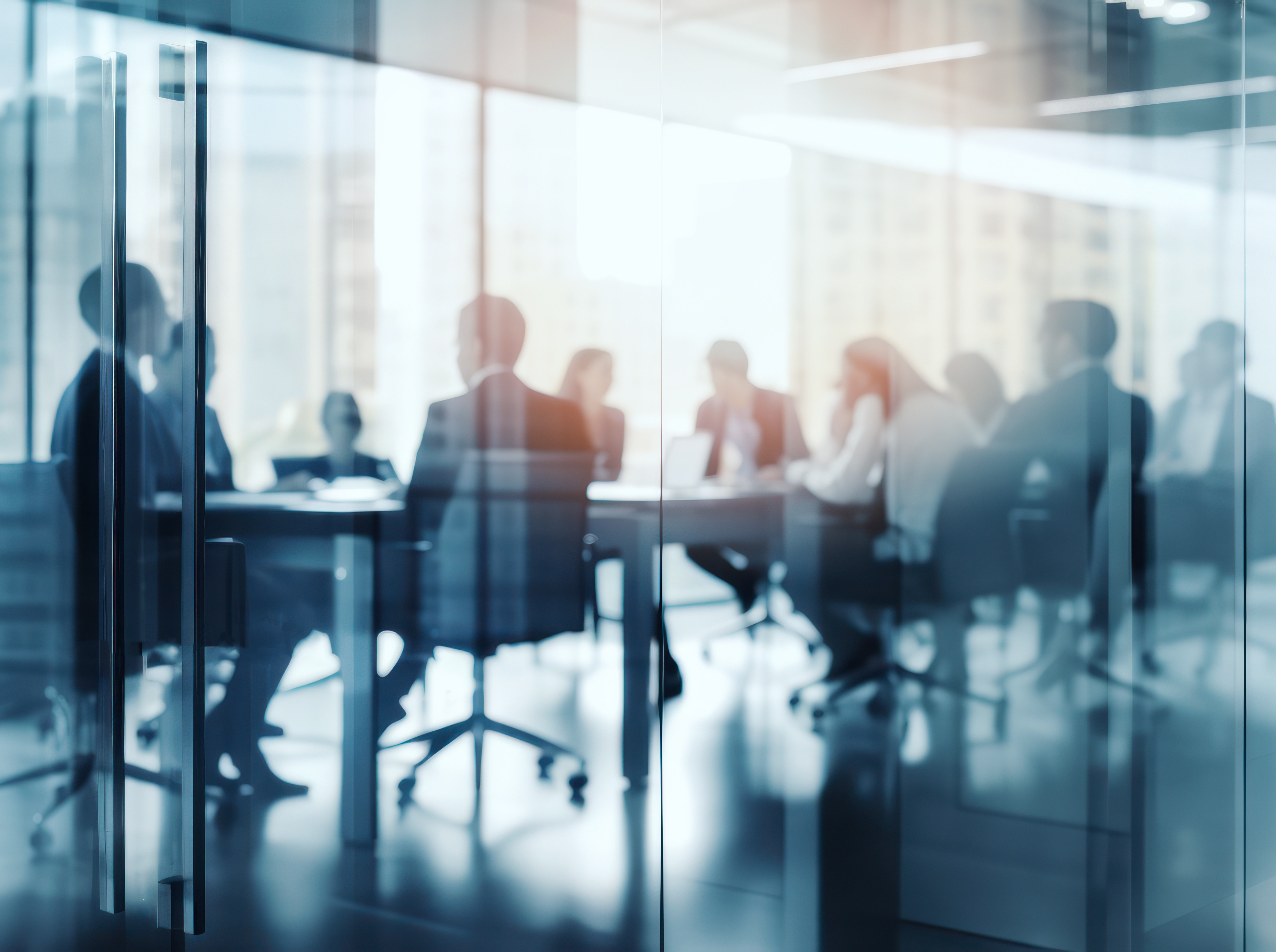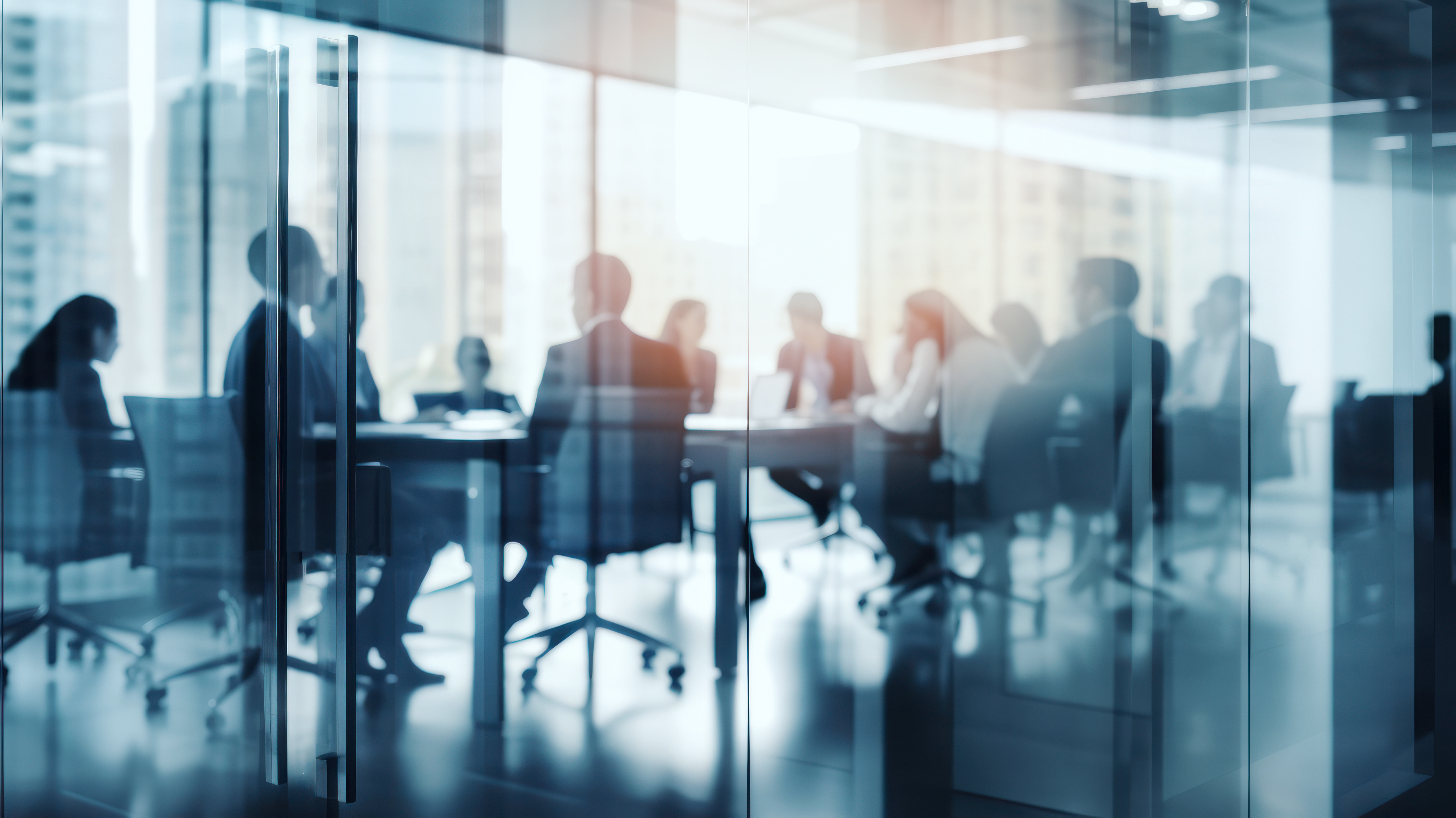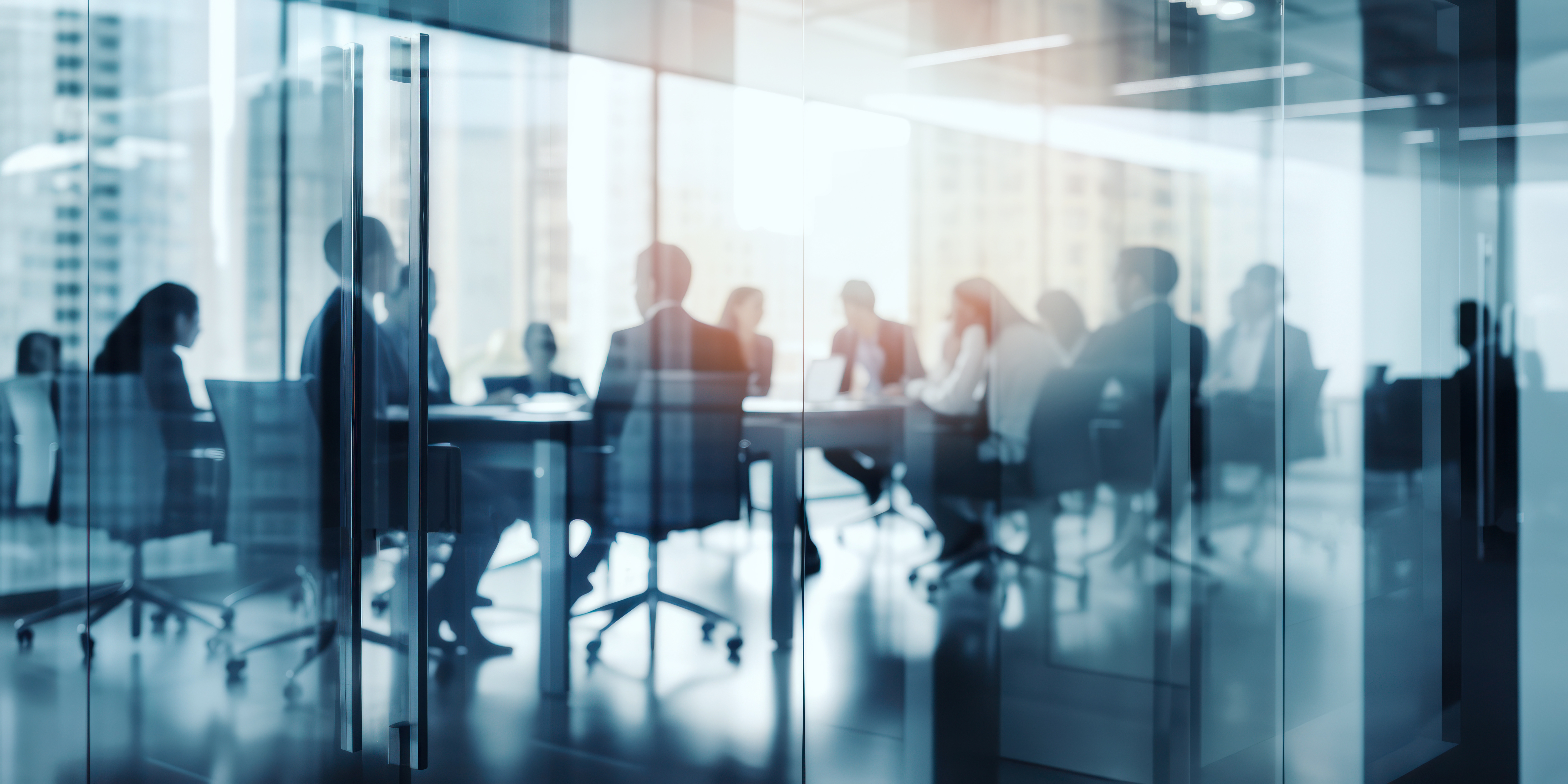 Blurred view of business professionals seated around a conference table in a modern glass-walled office with city skyline visible through large windows.