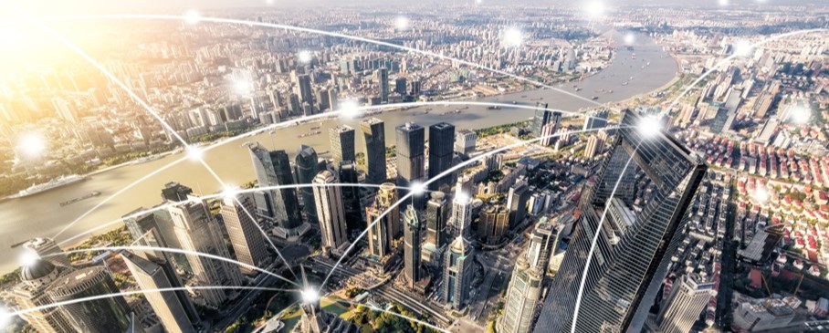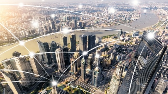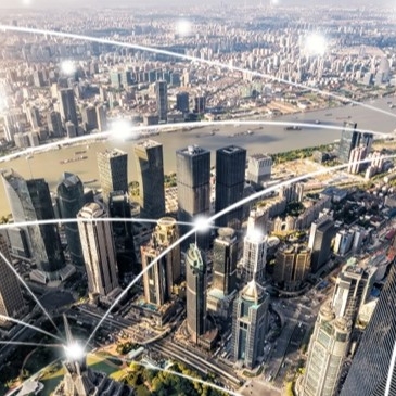 Aerial view of Shanghai’s Pudong financial district with stylized digital connectivity lines illustrating corporate and economic networks in China.