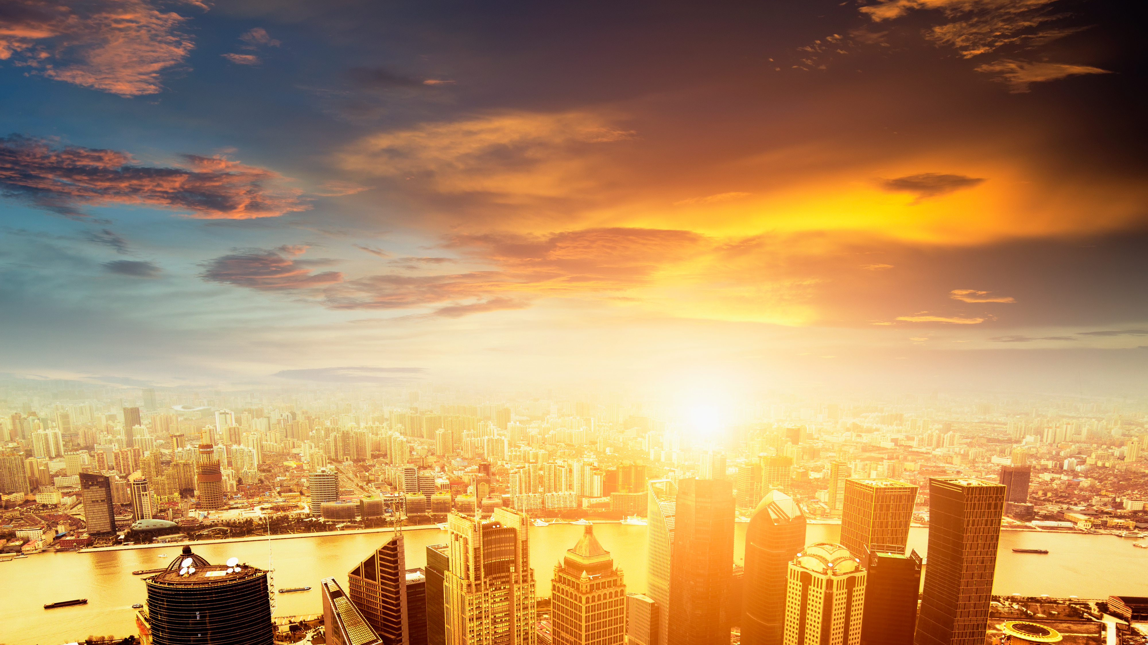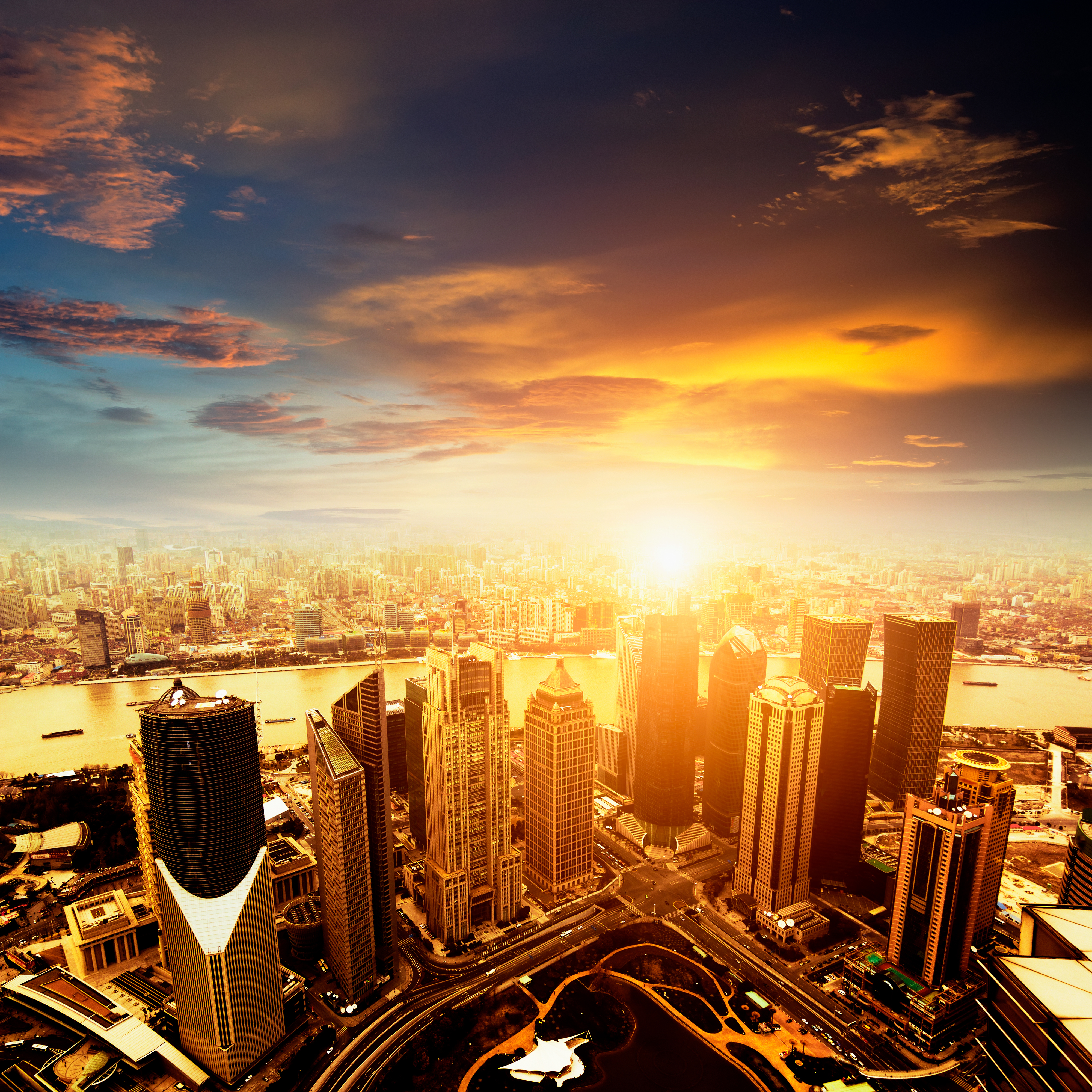 Aerial view of Shanghai's Pudong district skyline at sunset, with the sun illuminating modern skyscrapers and the Huangpu River under a dramatic sky, representing China's financial sector and urban development.