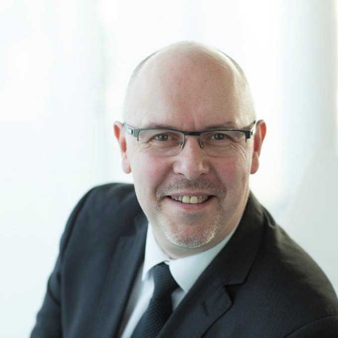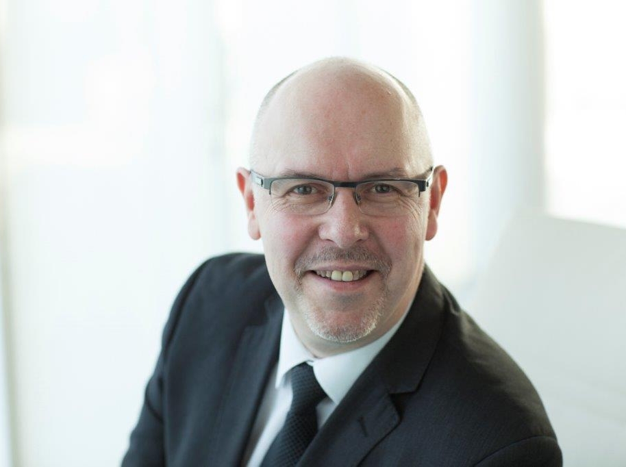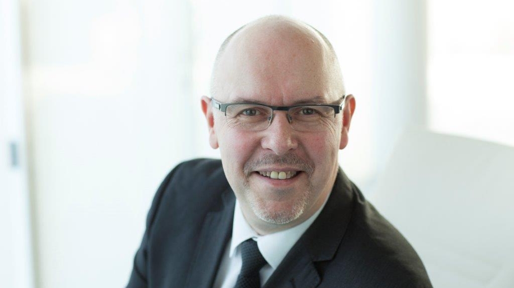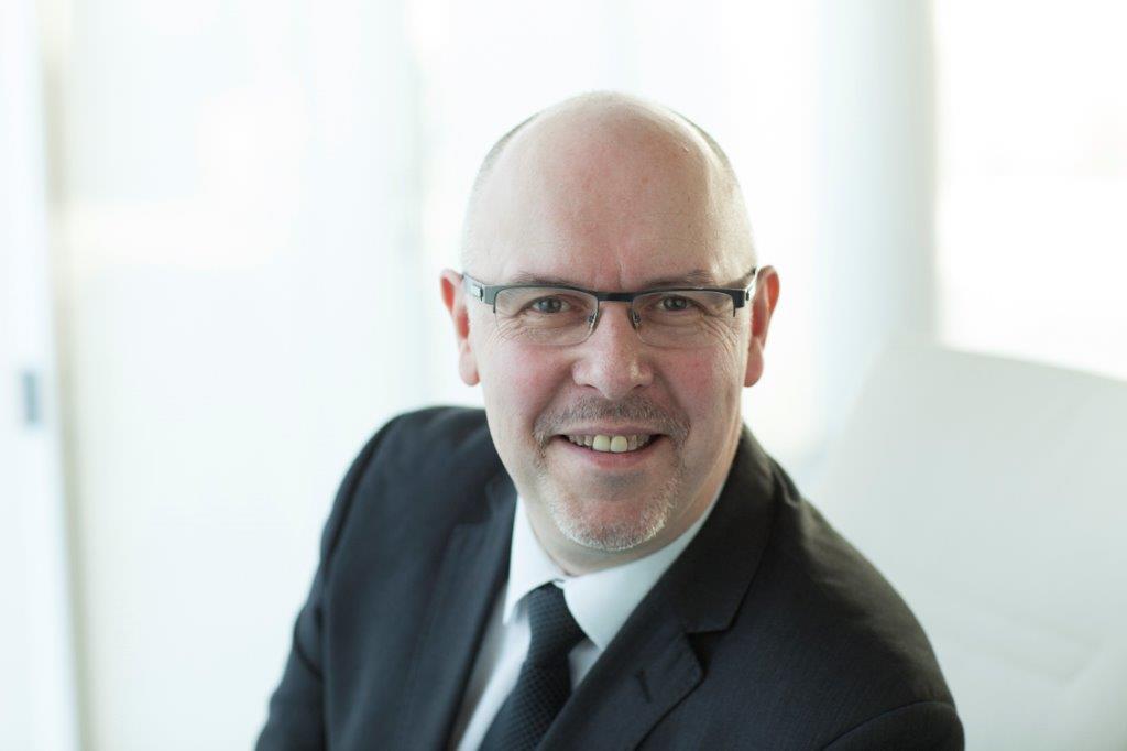 Portrait of a business executive in a dark suit and tie seated in a bright modern office environment.