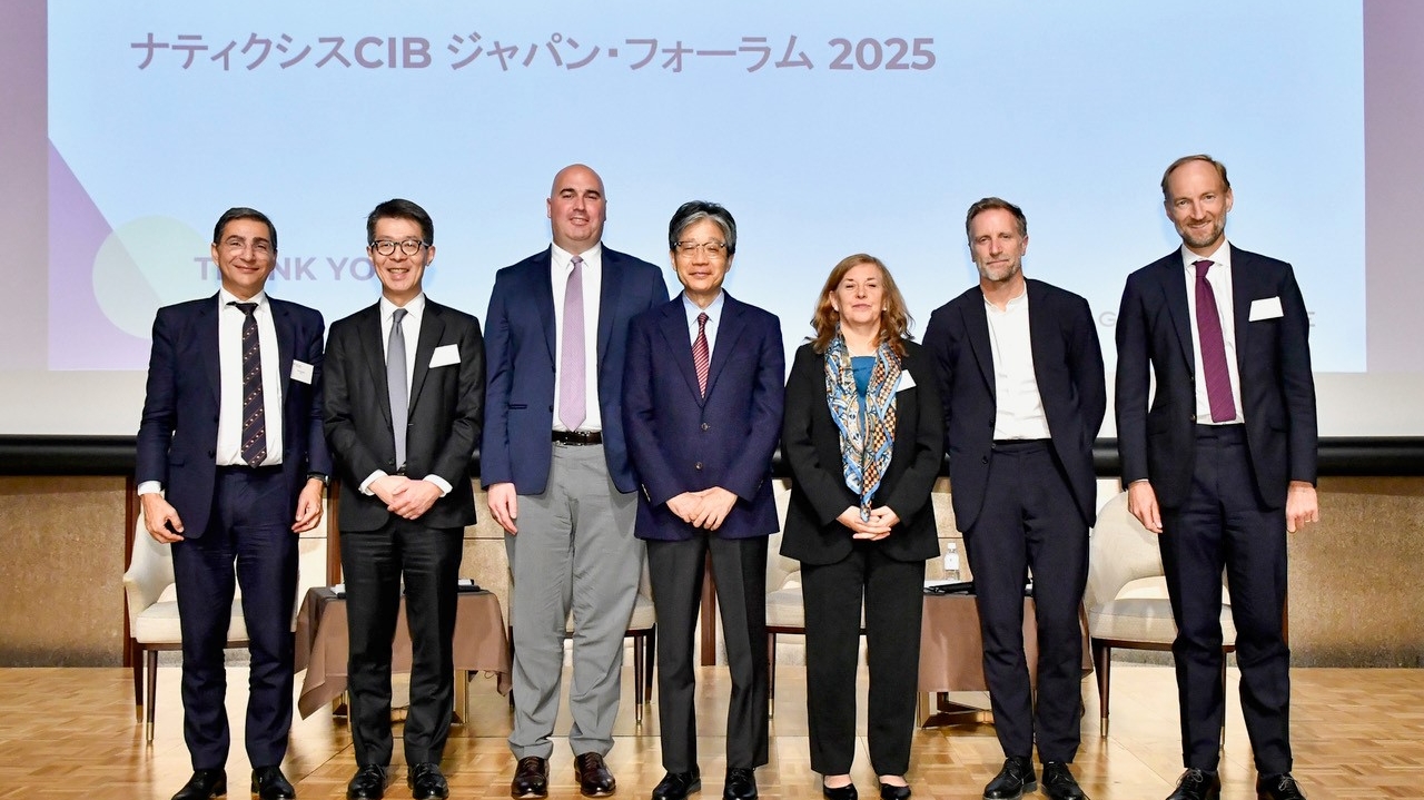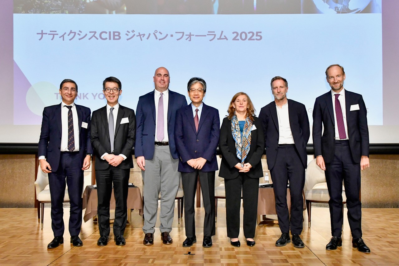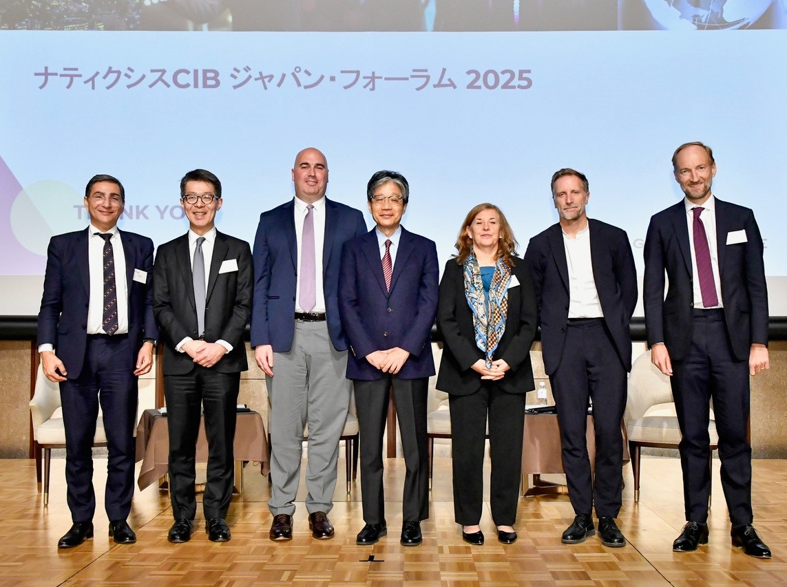 Group of Natixis CIB executives standing on stage in front of screen displaying Natixis CIB Japan 2025 during annual flagship conference in Japan.