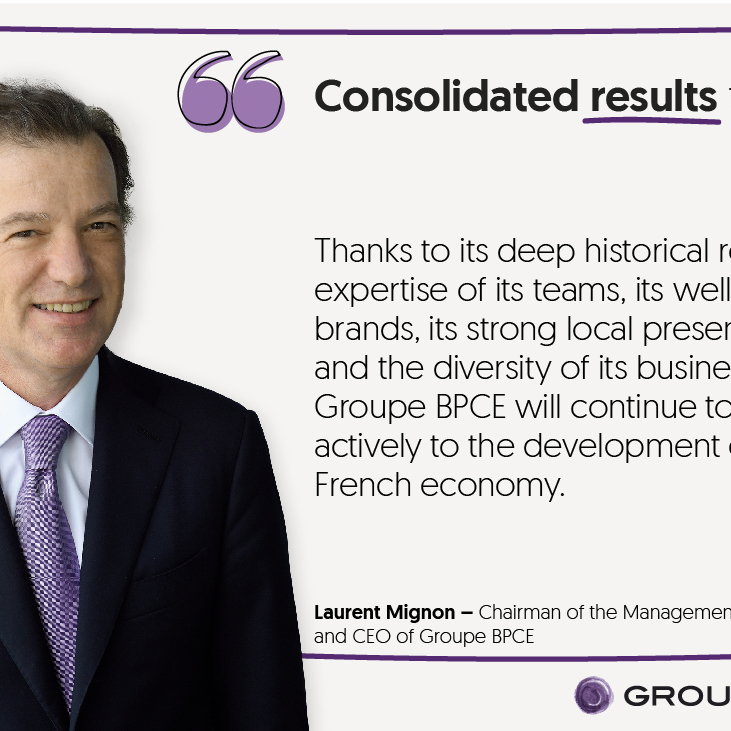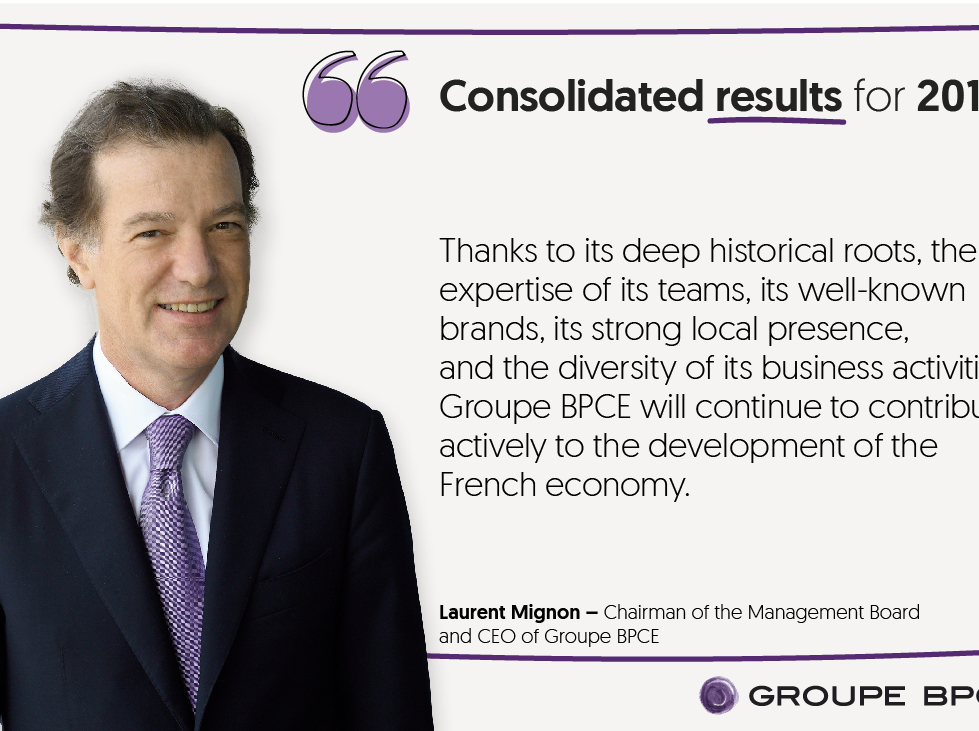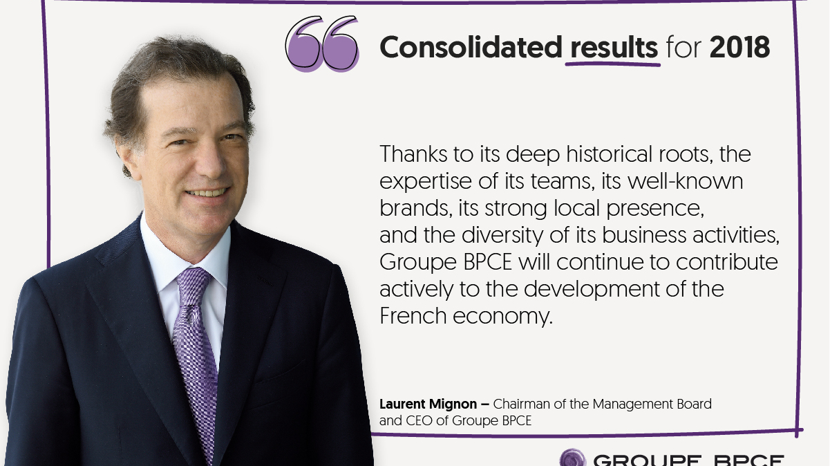 Laurent Mignon, Chairman of the Management Board and CEO of Groupe BPCE, is pictured alongside a statement highlighting the group's consolidated results for 2018, emphasizing local presence, team expertise, and contribution to the French economy.