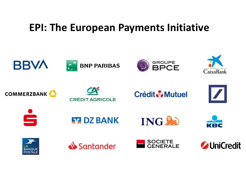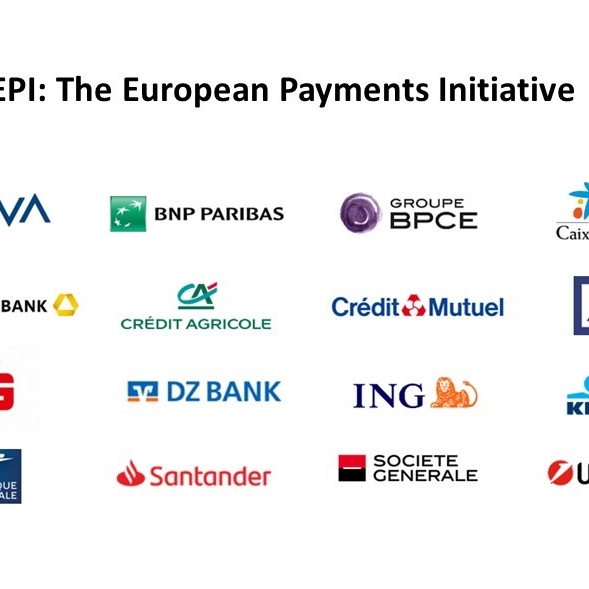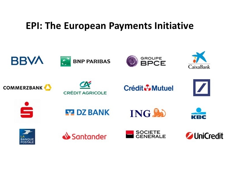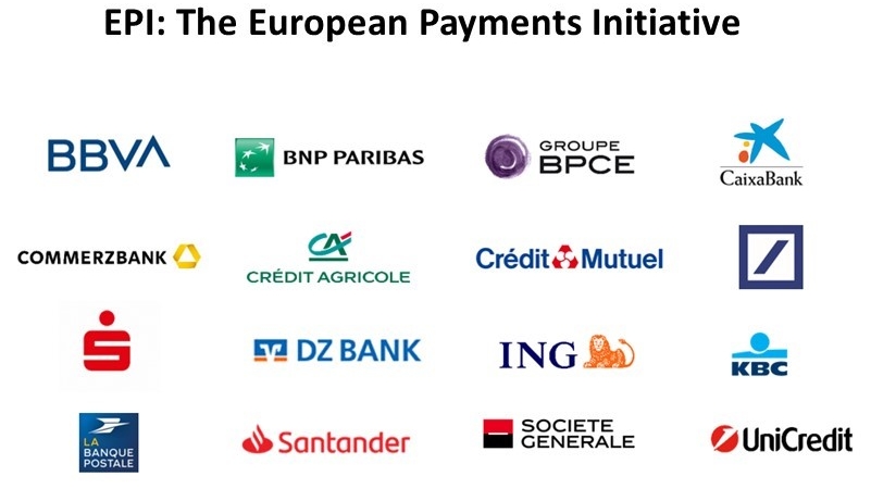 Logos of major European banks participating in the European Payments Initiative, a unified digital payment scheme.
