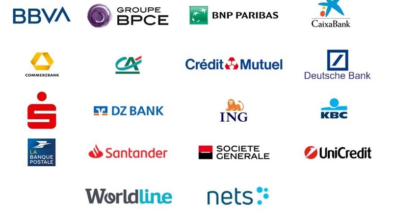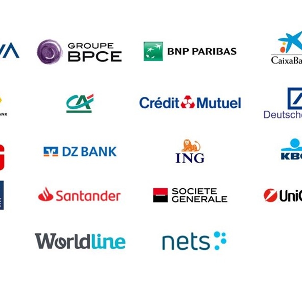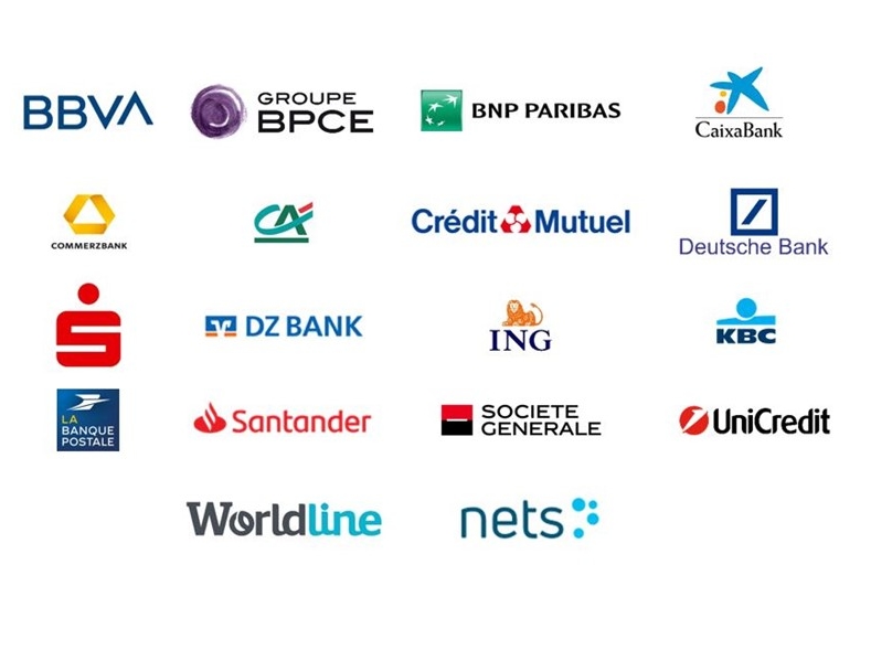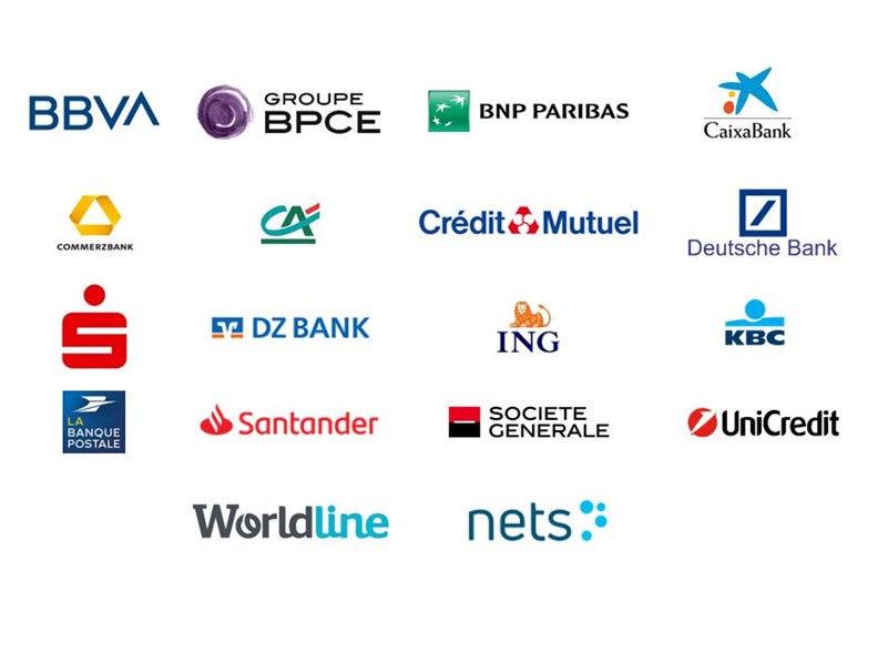 Logos of major European banks and payment providers participating in the European Payments Initiative (EPI).