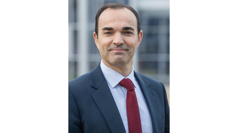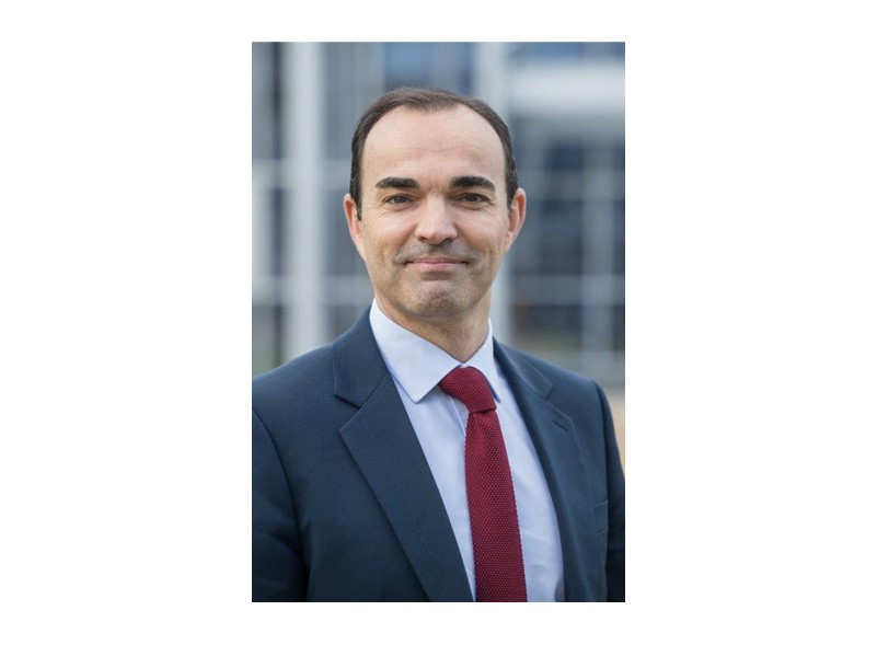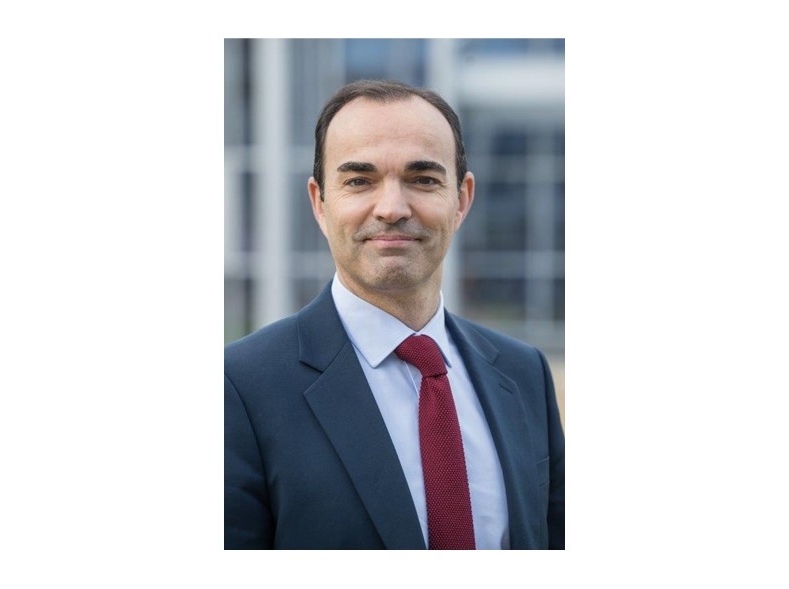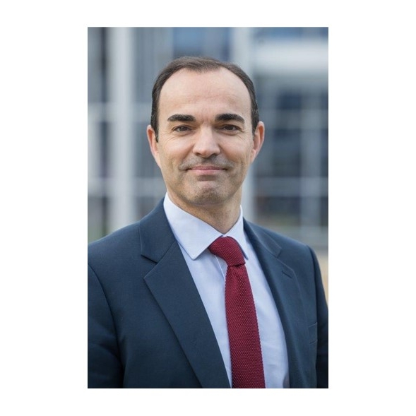 Portrait of Julien Nègre, new CEO of Natixis Interépargne, in navy suit with red tie against modern building background.
