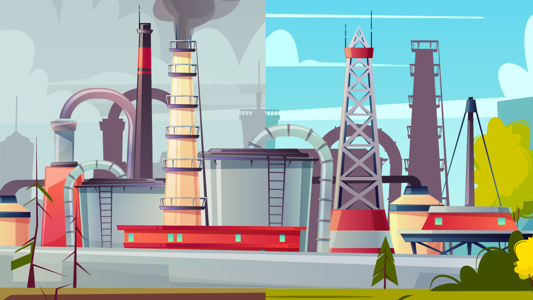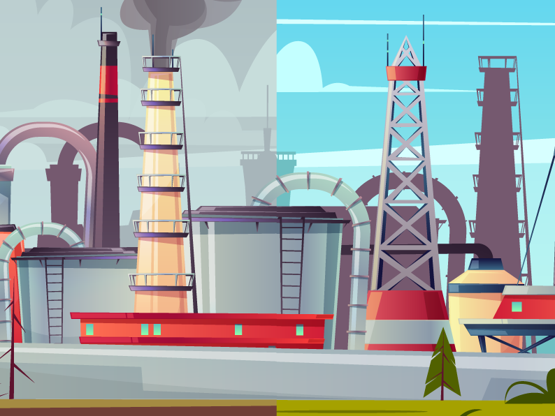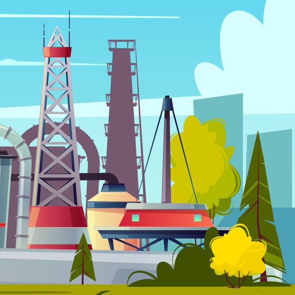 Illustration of a large industrial refinery complex with storage tanks, chimneys and pipelines set in a semi-urban landscape.