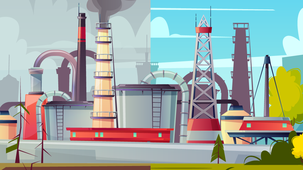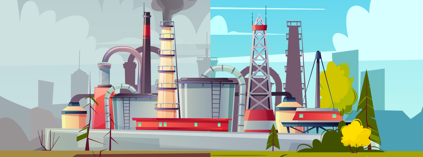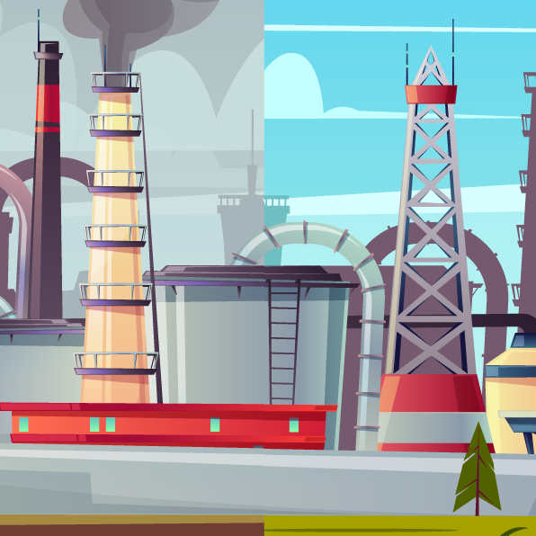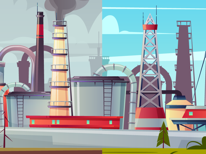 Illustrated industrial refinery complex with chimneys, storage tanks and pipelines set in a semi-urban landscape with surrounding trees.