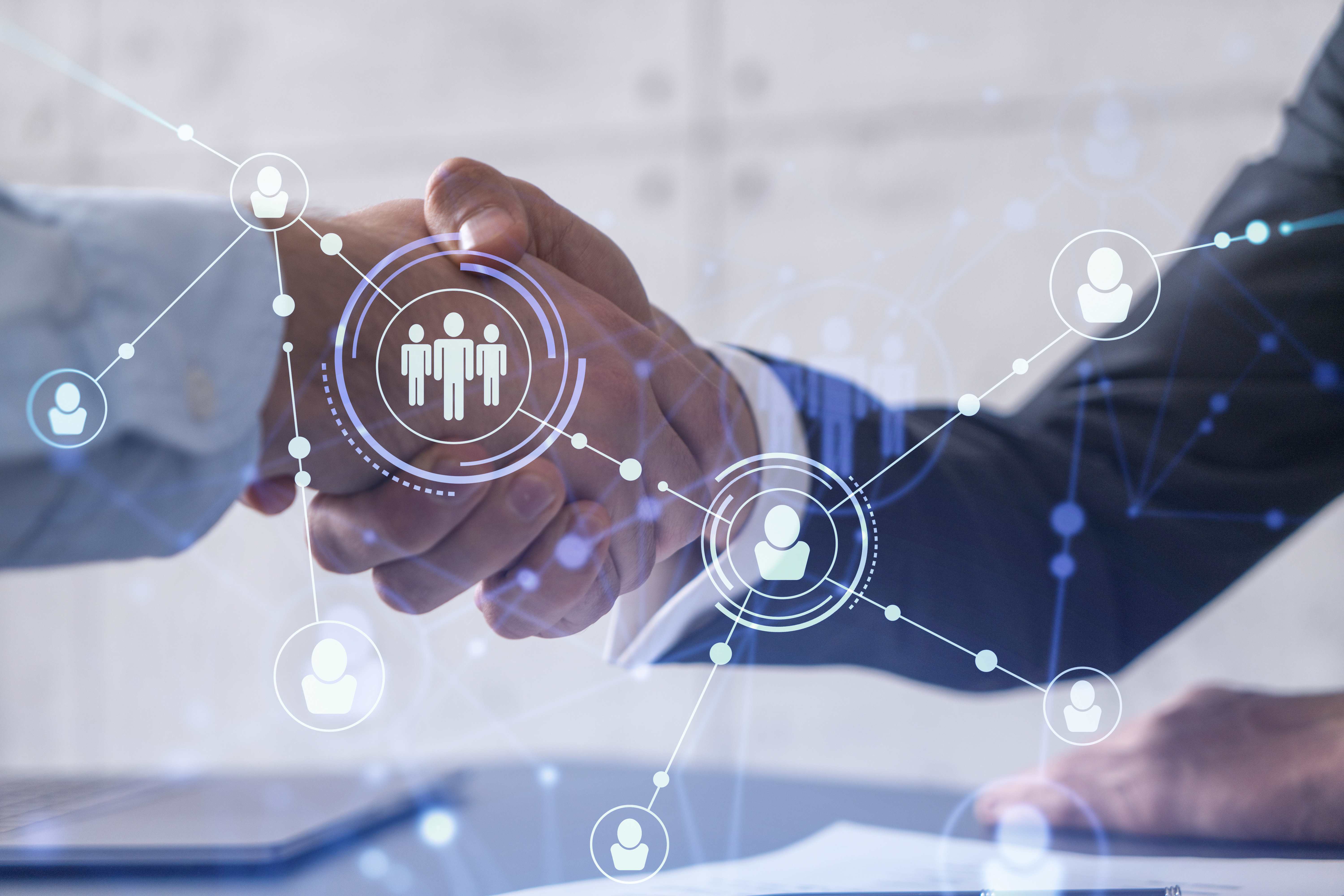 Digital handshake with network connections and user icons symbolizing tech partnership between Natixis CIB and Clipperton in M&A.