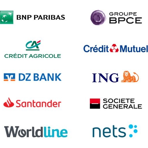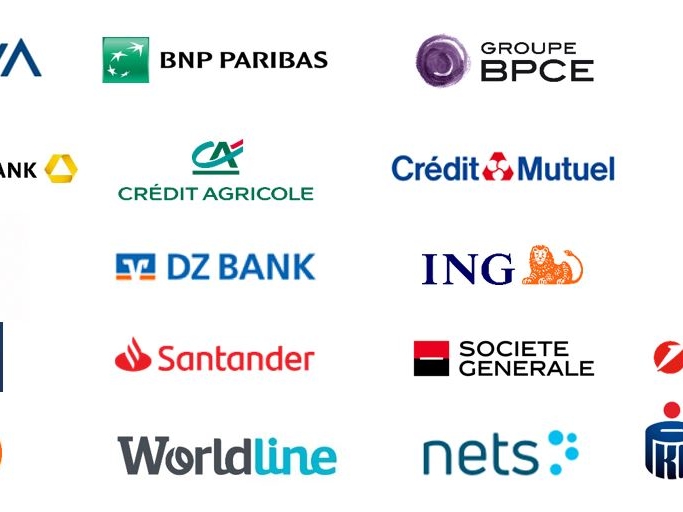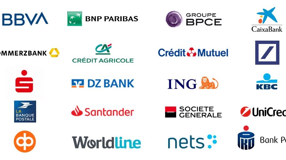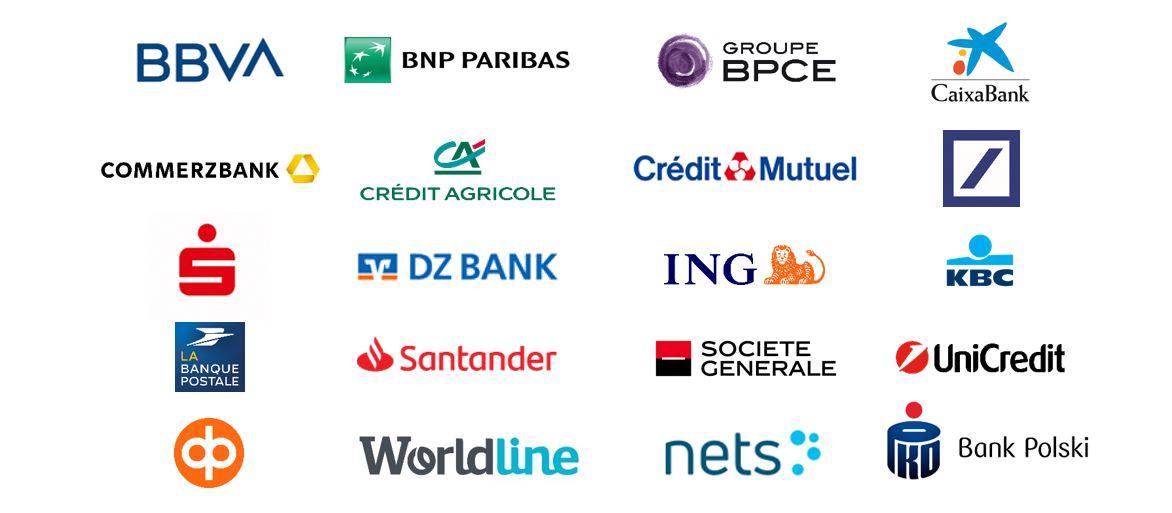 Logotypes of major European banks and payment providers, including BBVA, BNP Paribas, Groupe BPCE, CaixaBank, Santander, Worldline, Nets and PKO Bank Polski.