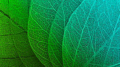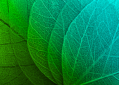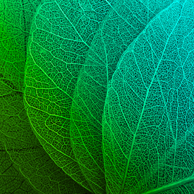 Macro photograph showing the intricate vein patterns of overlapping green leaves, highlighting natural leaf texture and vibrant color gradients.