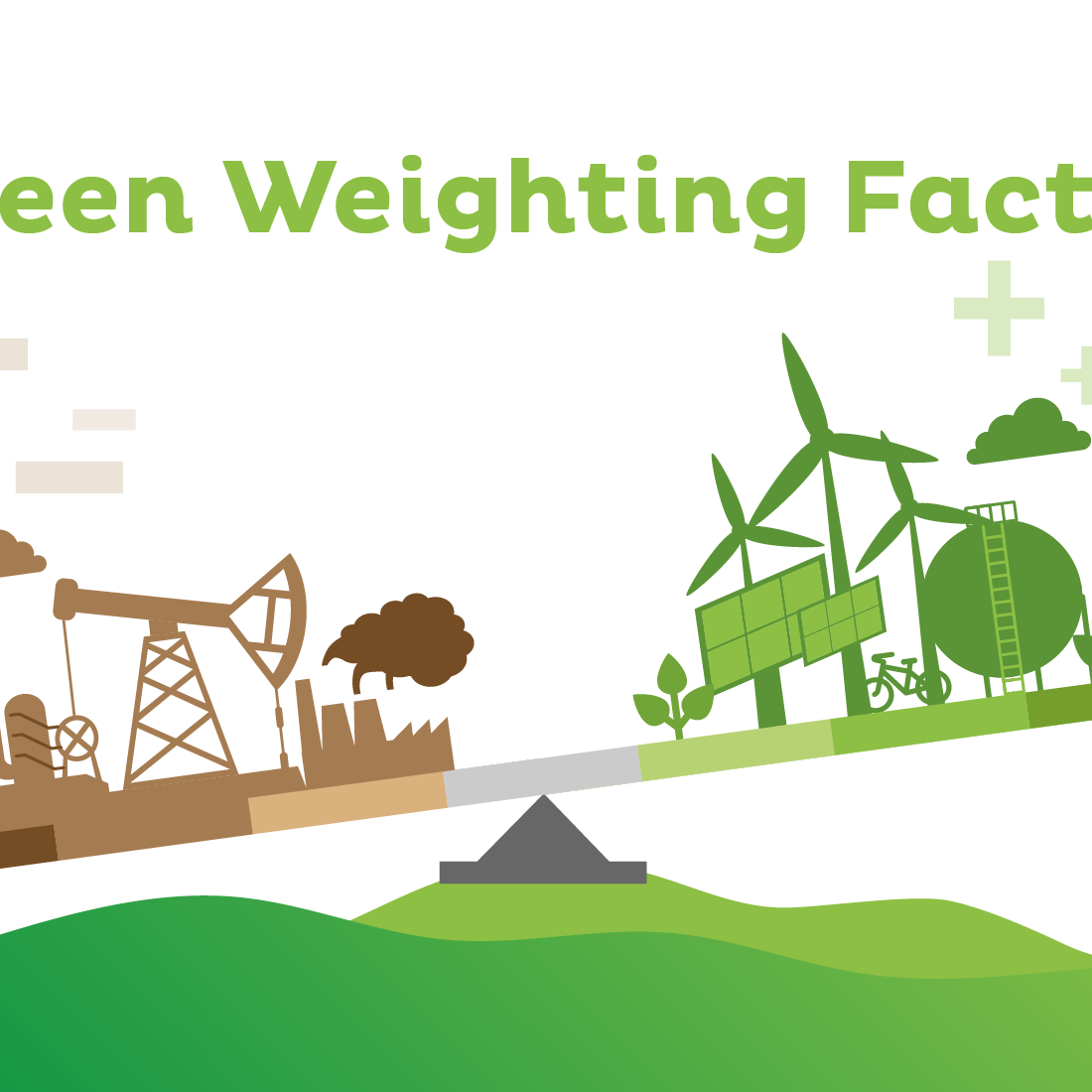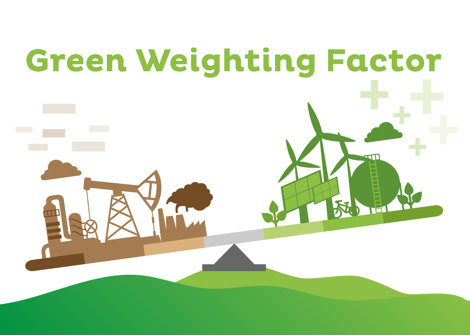 Illustration representing the Green Weighting Factor, showing a balance scale with brown fossil fuel and industry icons on one side and green renewable energy icons on the other, symbolizing Natixis’ climate impact capital allocation mechanism.