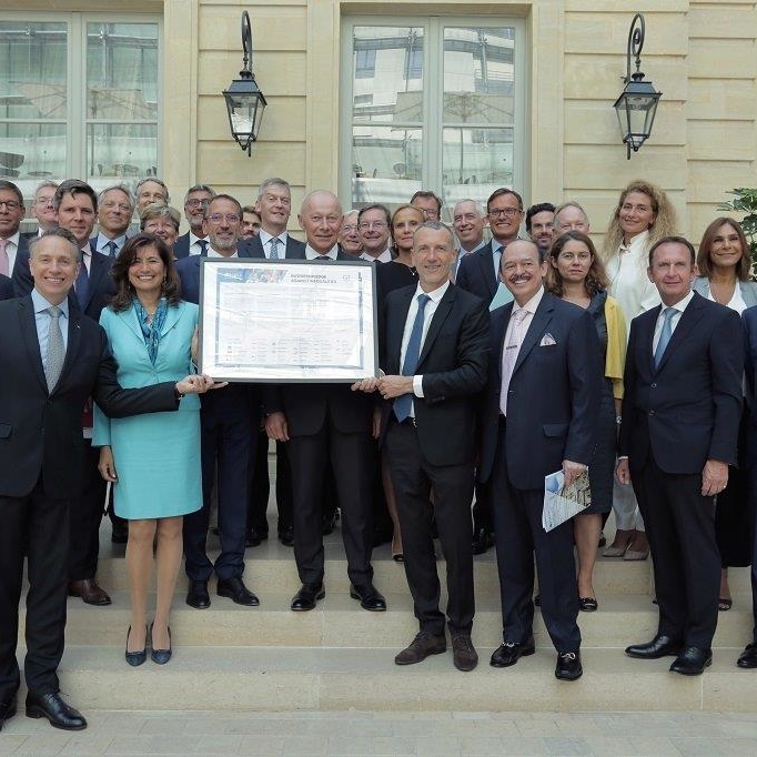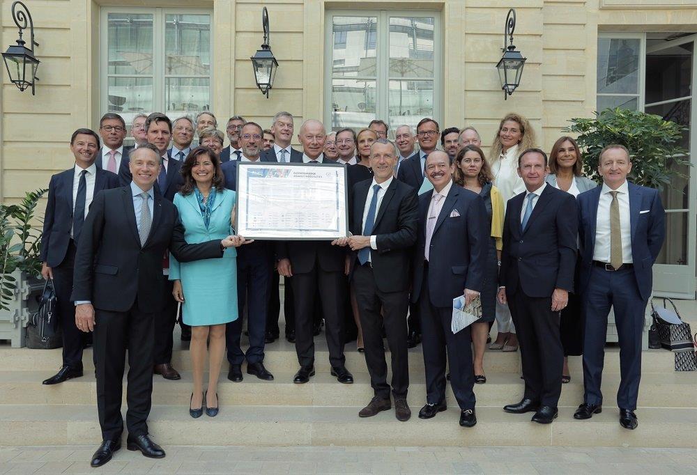 Group photo of Groupe BPCE executives and partners standing together at an official event, holding a document to symbolize their commitment to the Business for Inclusive Growth (B4IG) coalition led by the OECD.
