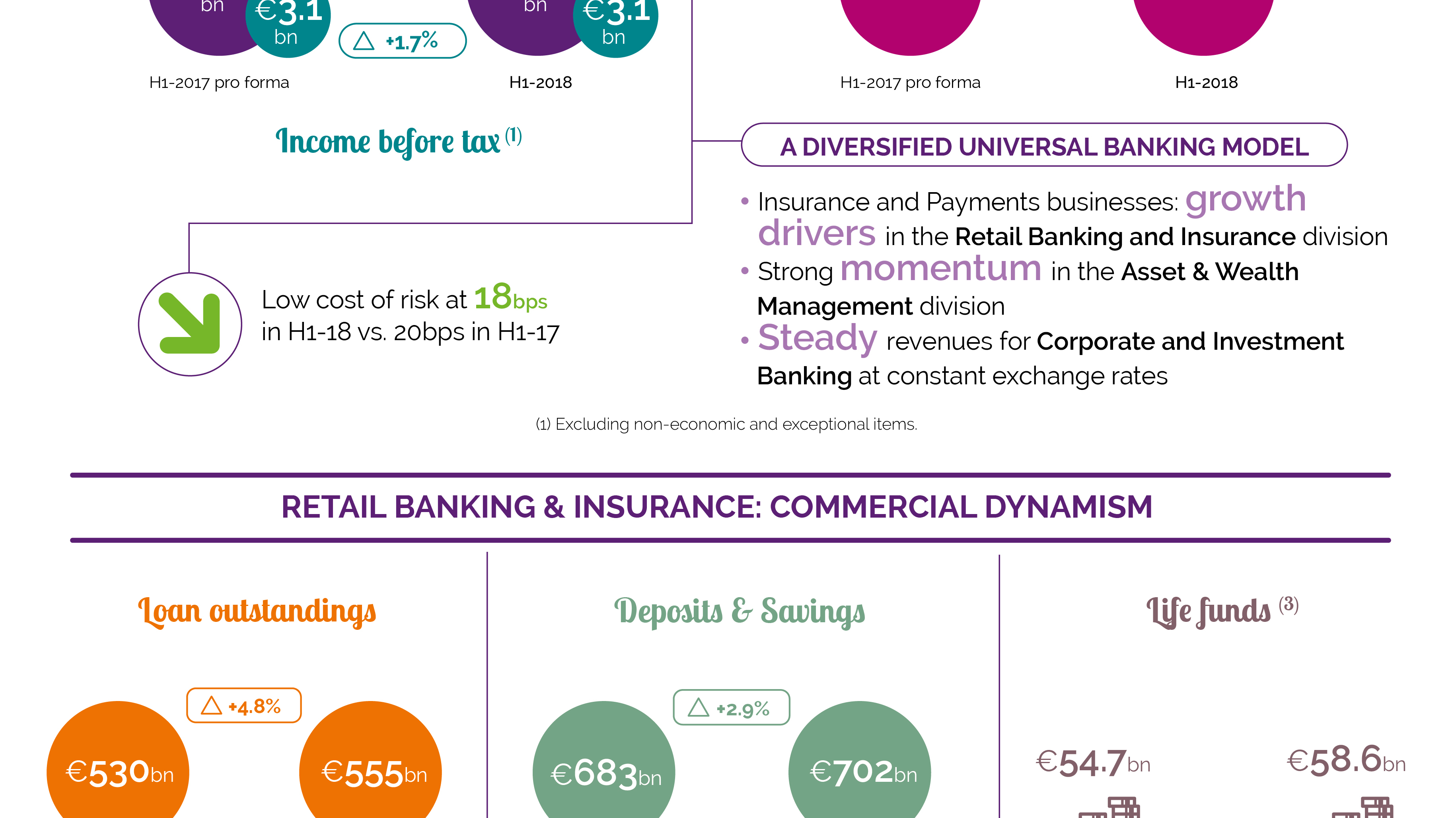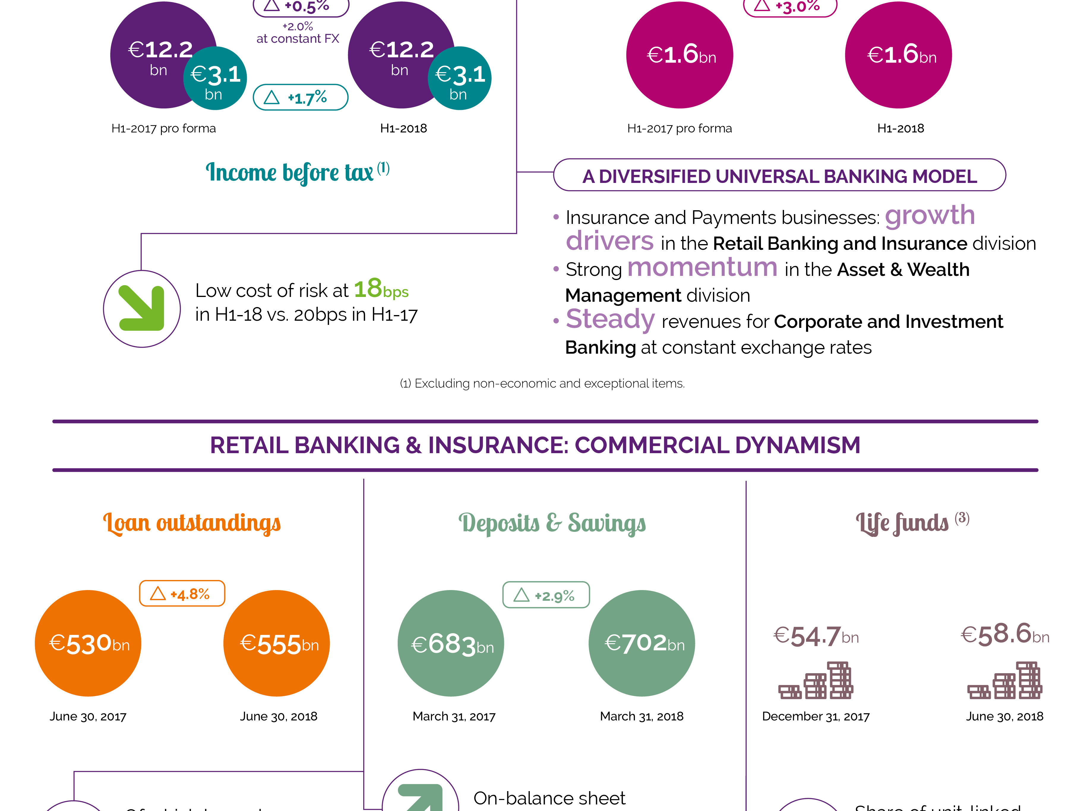 Infographic presenting Groupe BPCE’s financial results for the first half of 2018, including growth in net banking income, attributable net income, loan outstandings, deposits and savings, and capital adequacy ratios.