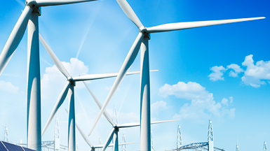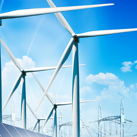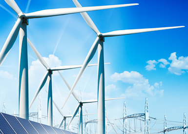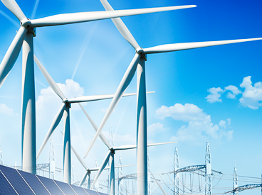 Wind turbines and solar panels generating renewable energy, with electrical transmission towers in the background under a blue sky.