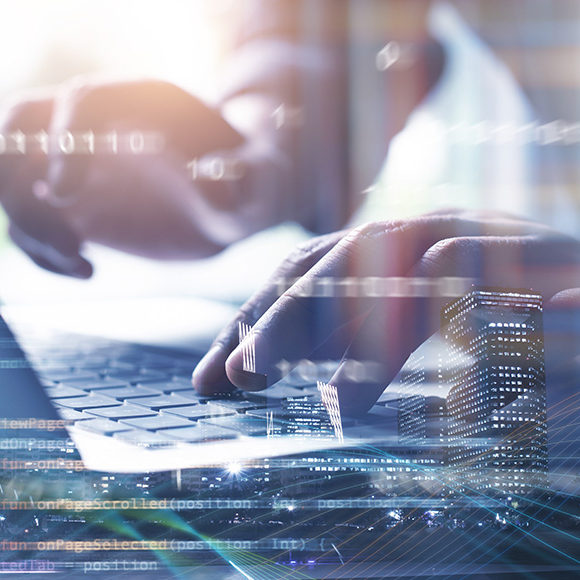 Hands typing on laptop keyboard in modern office setting, representing digital technology work for banking IT platform.
