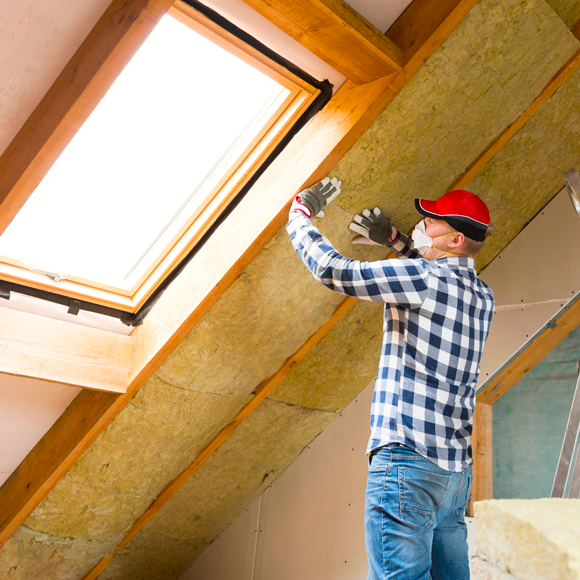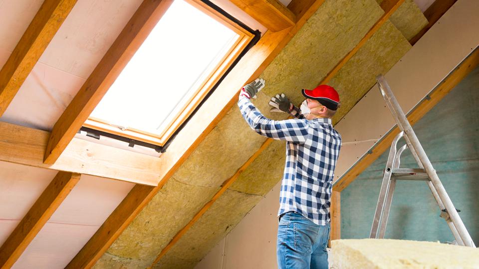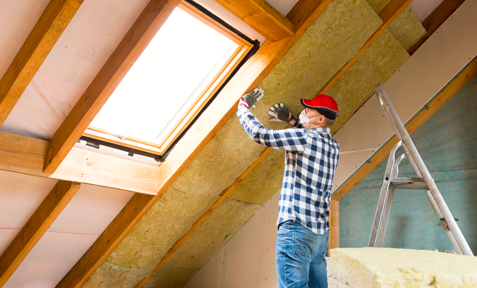 Worker installing fiberglass insulation along wooden frame of skylight shaft in attic space for energy retrofitting.