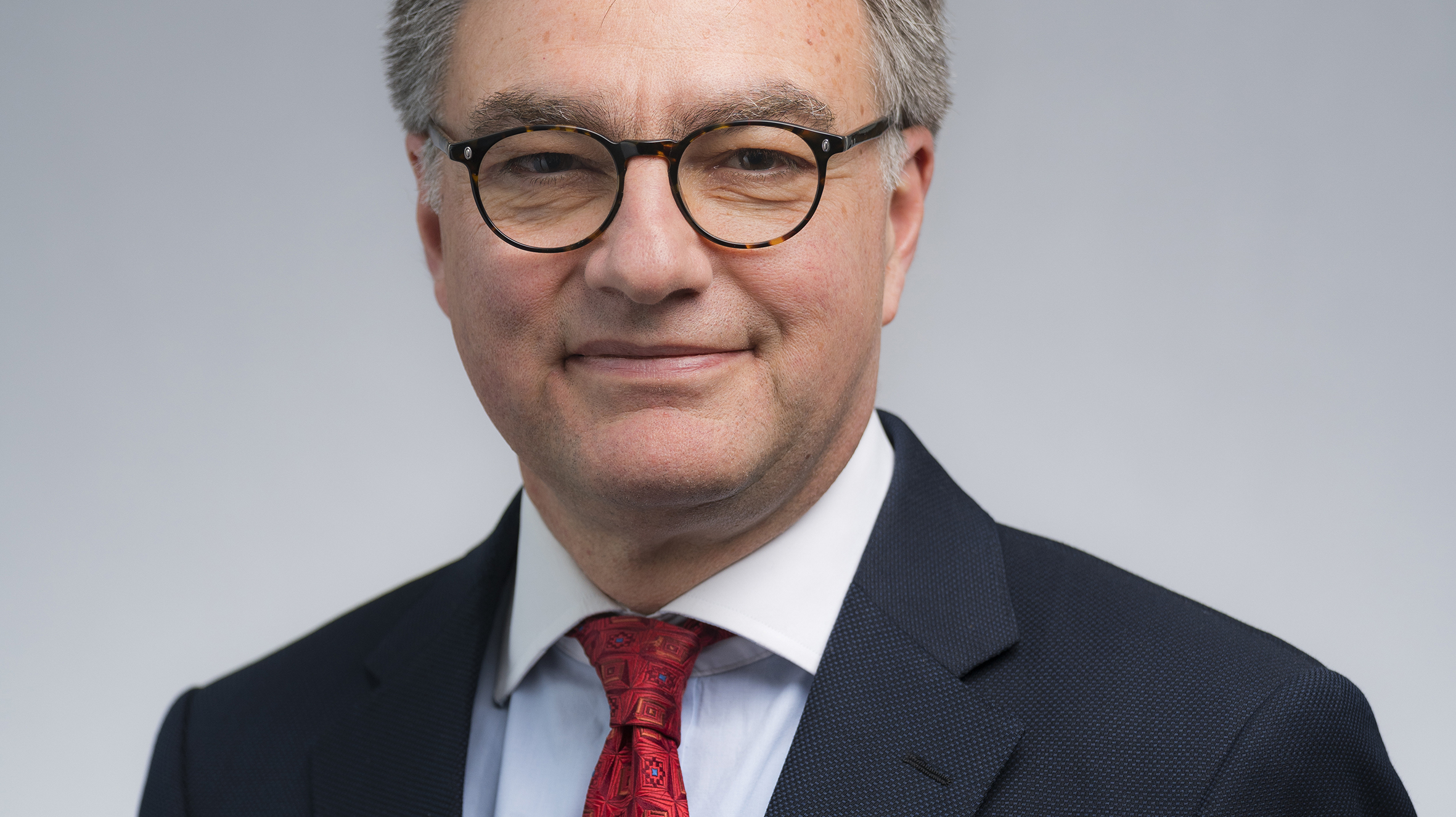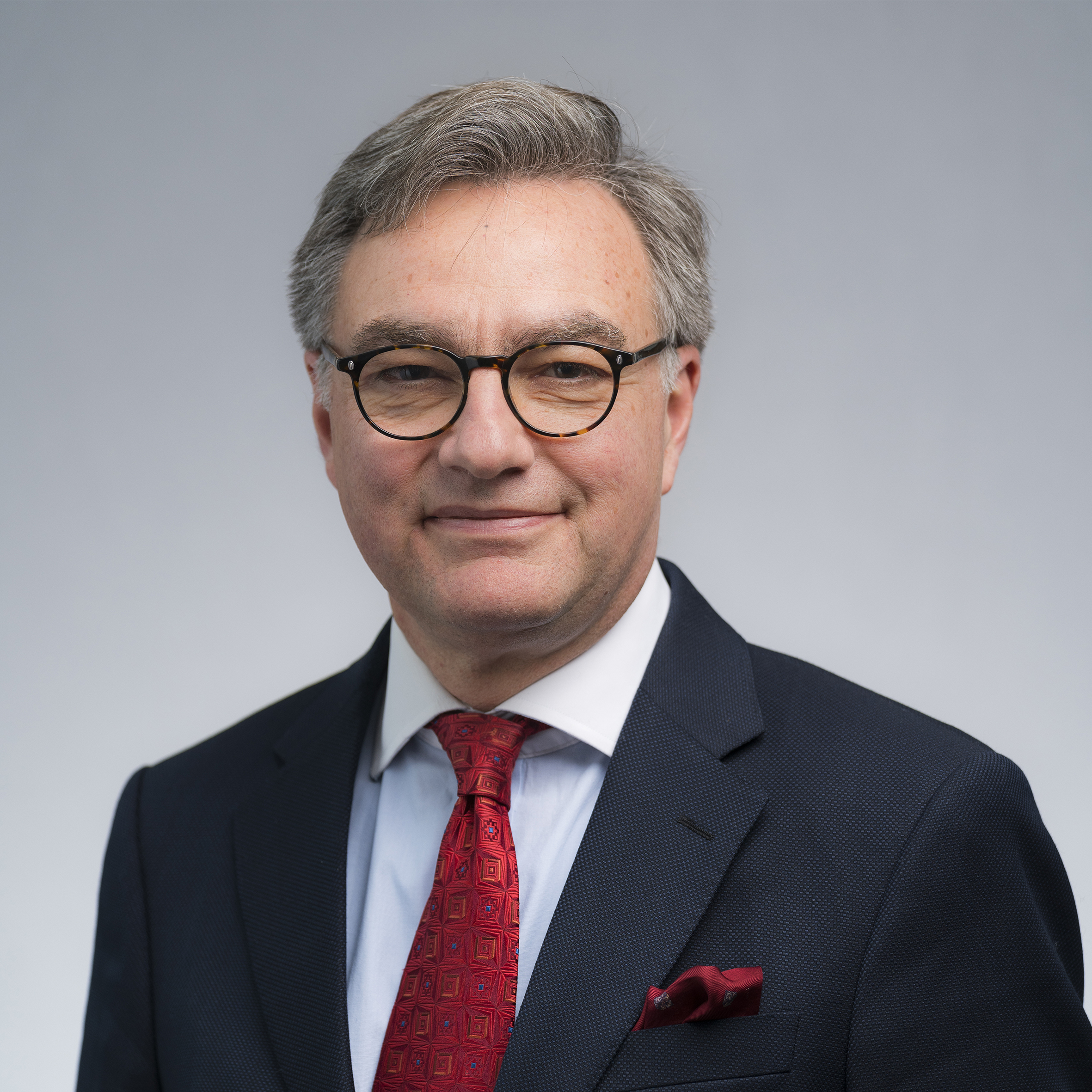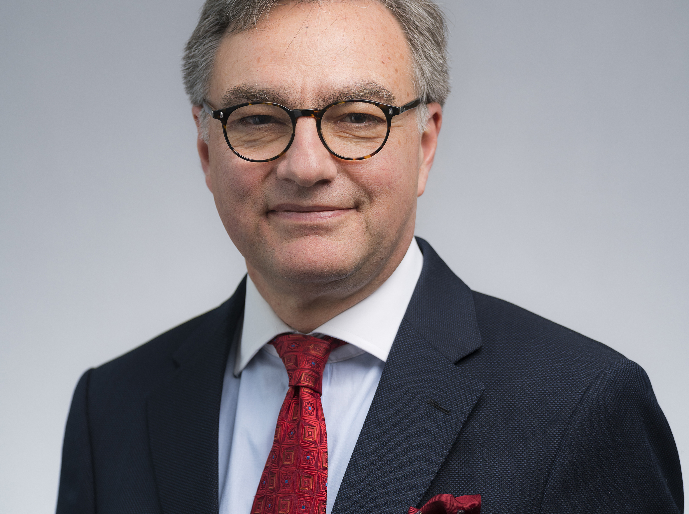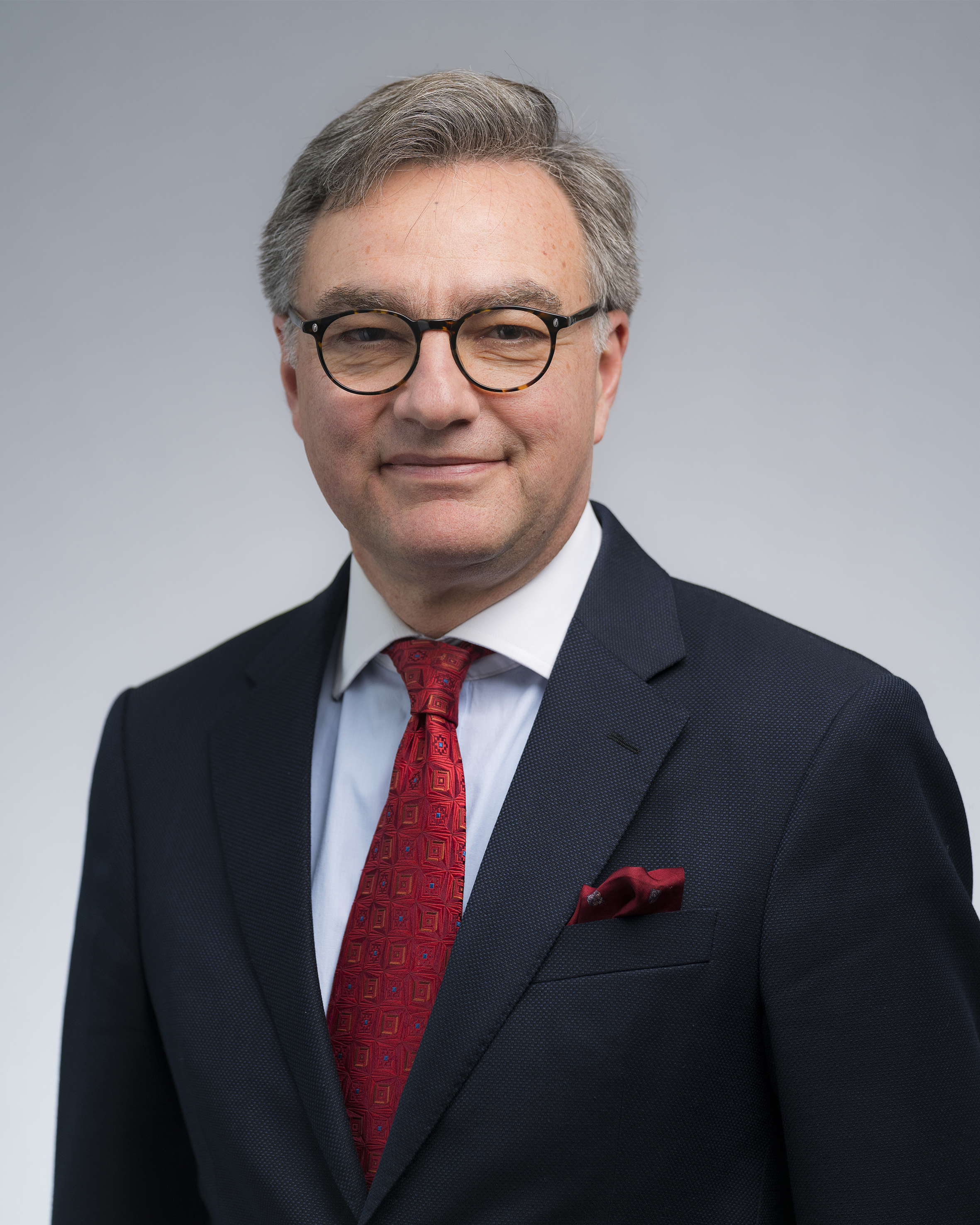 Portrait of a senior executive in navy suit with red tie and pocket square on neutral background