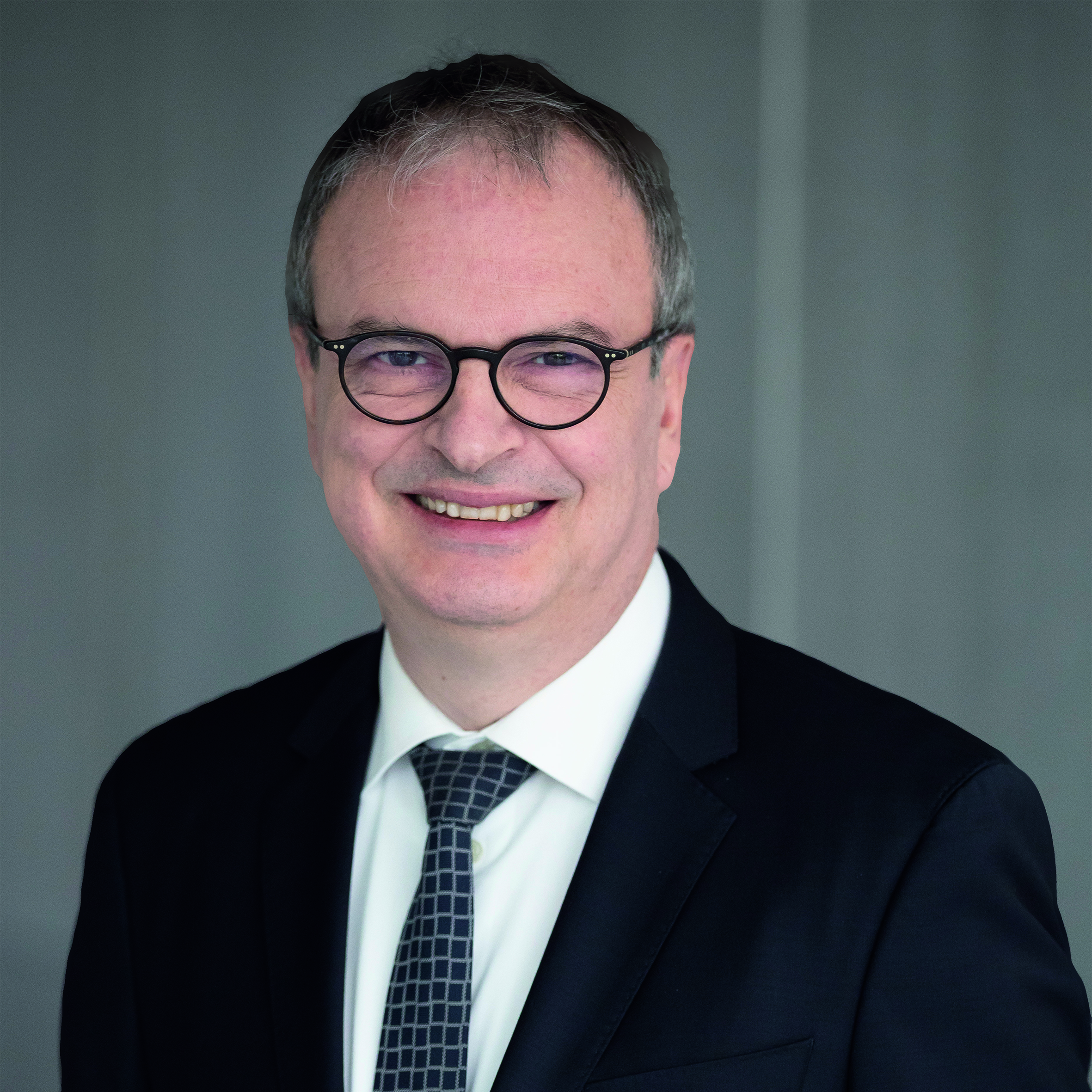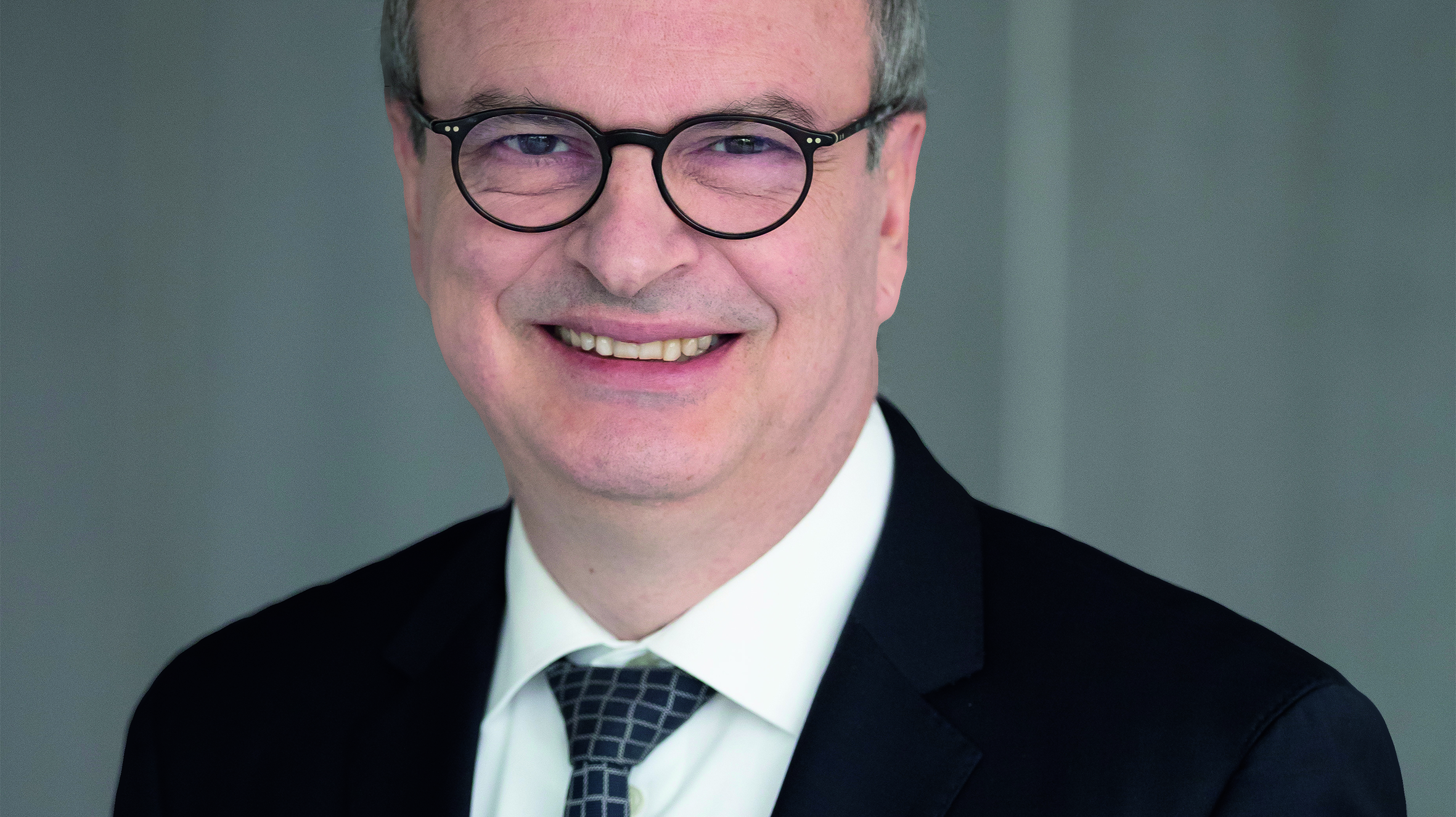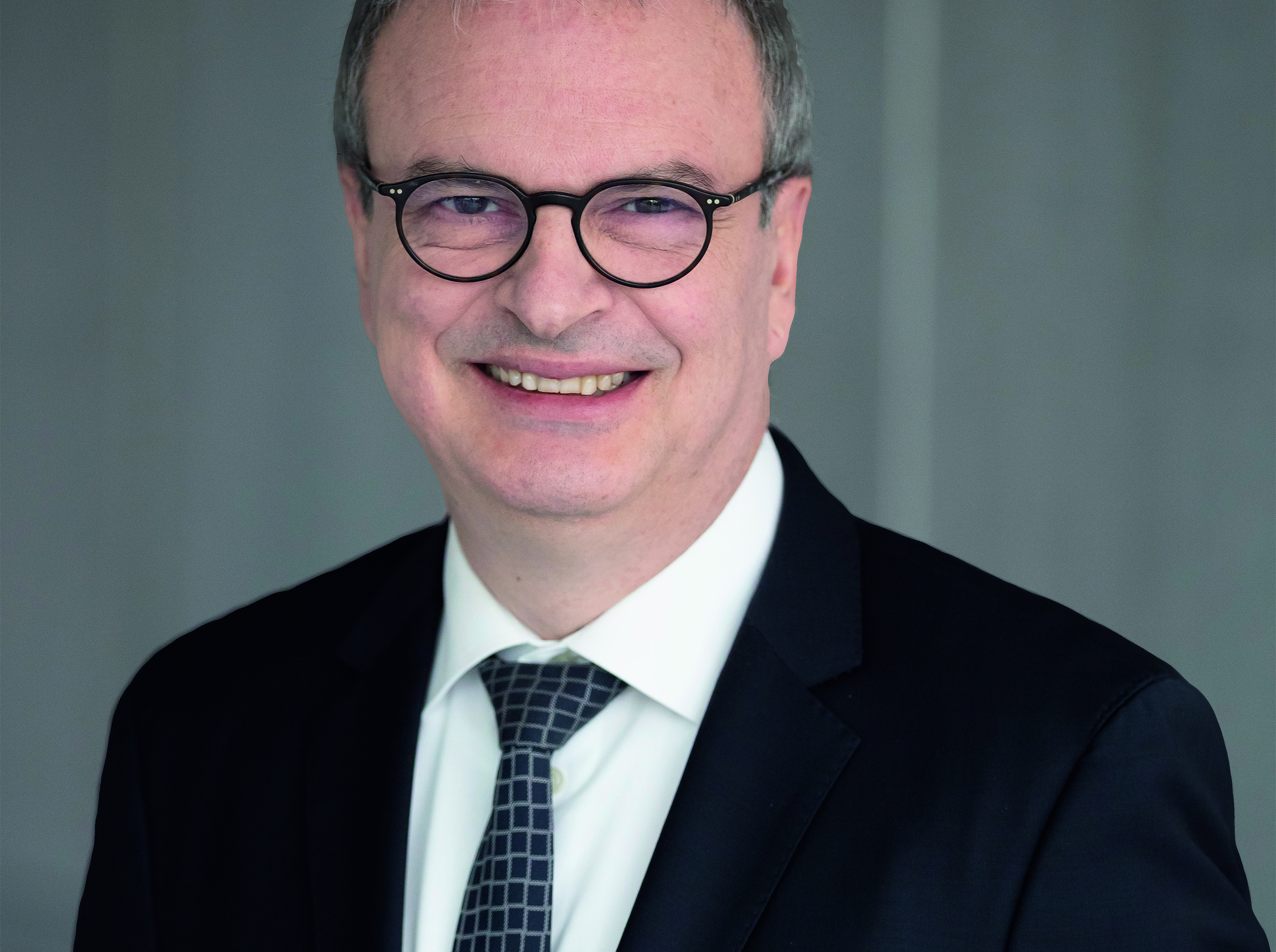 Portrait of a senior executive wearing glasses and a suit, photographed against a plain corporate background.