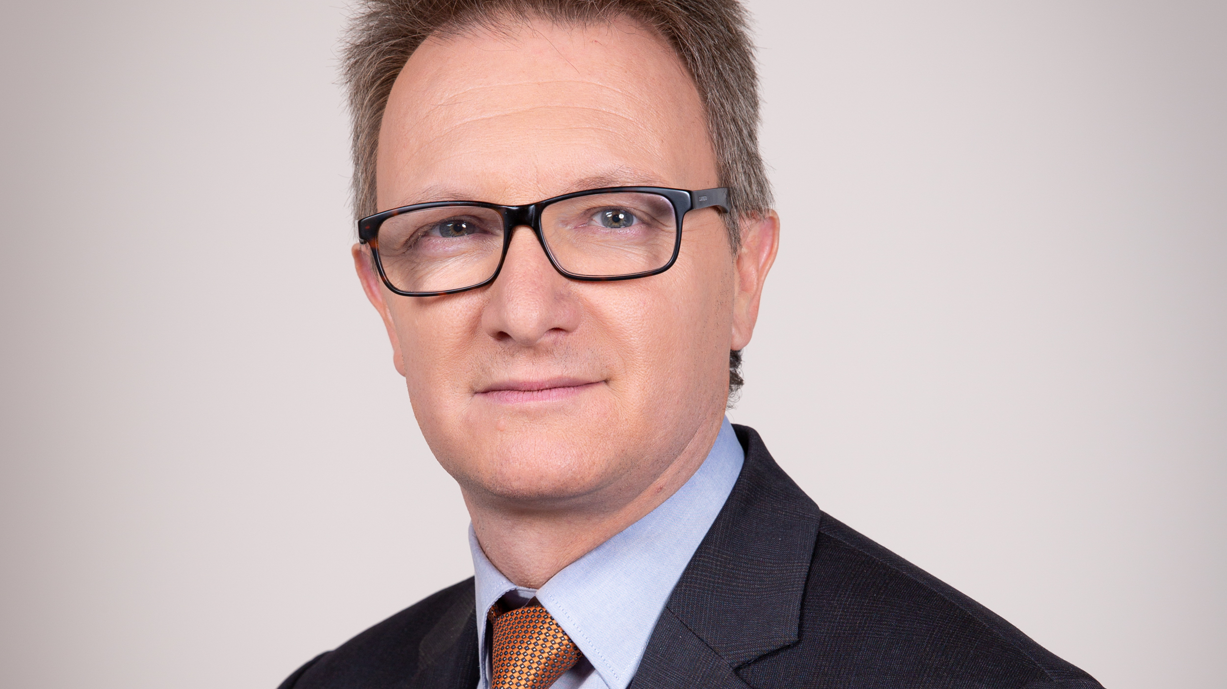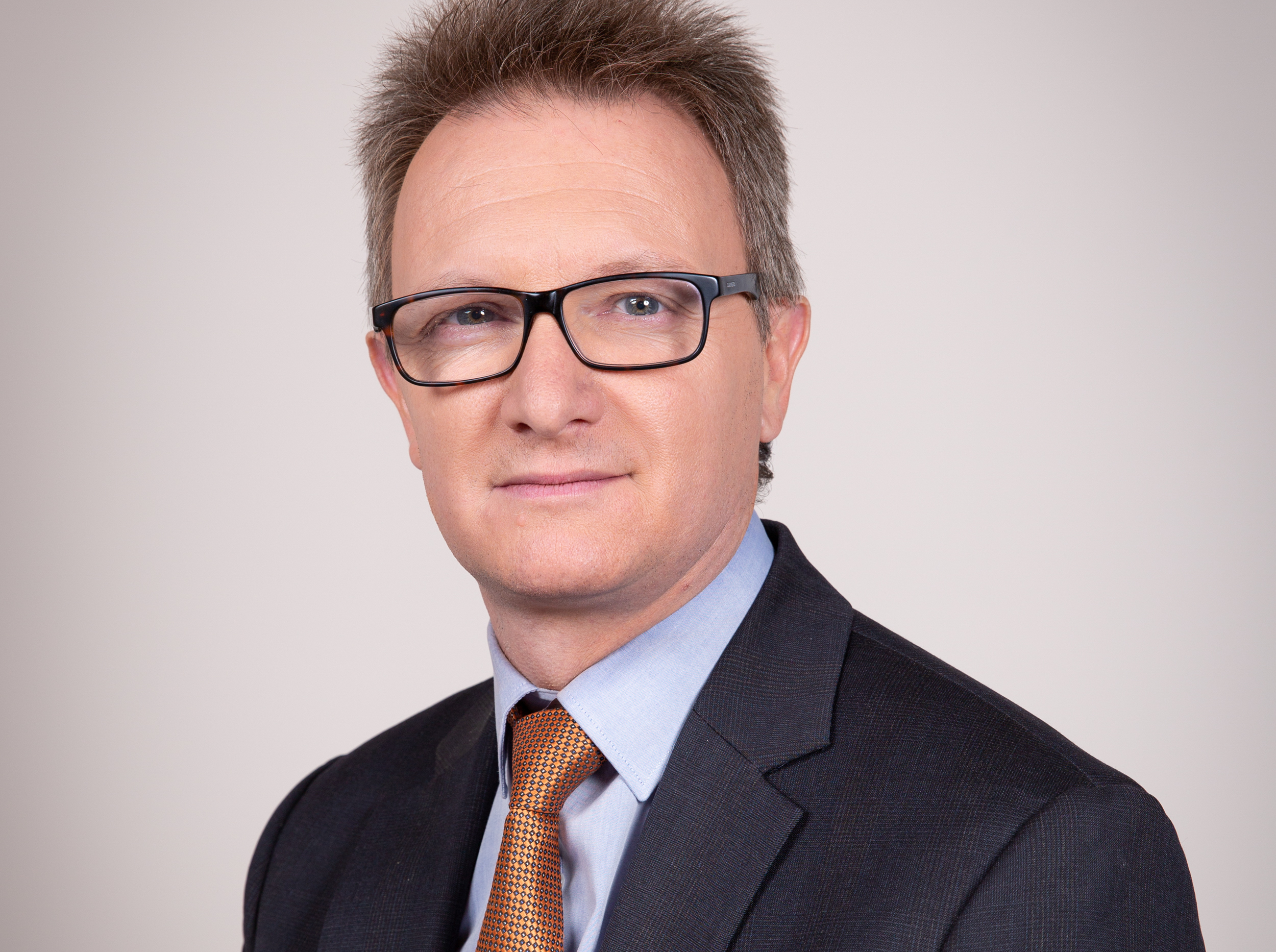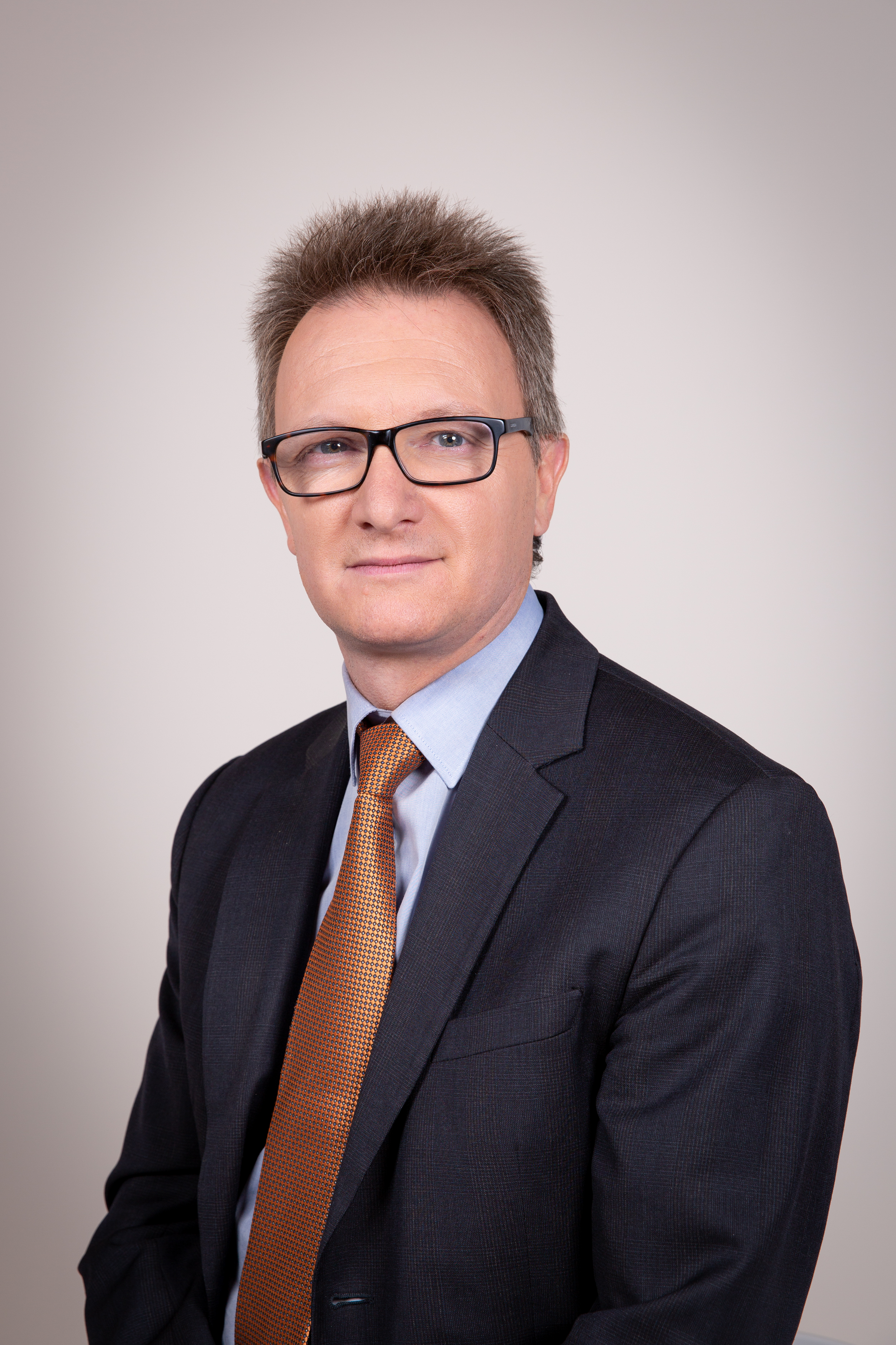 Corporate studio portrait of a male executive wearing a dark suit and orange tie against a neutral background.