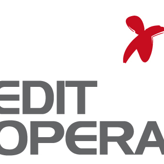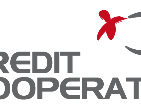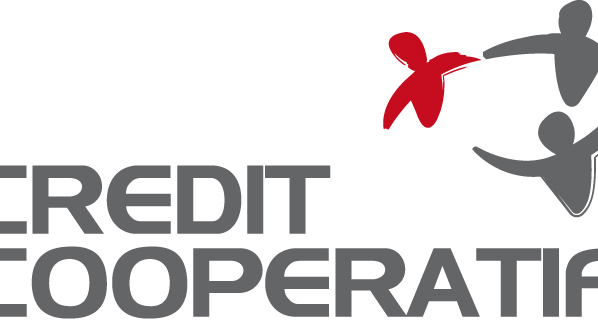 Credit Coopératif logo featuring stylized human figures in red and gray forming a circle, symbolizing cooperation and solidarity.