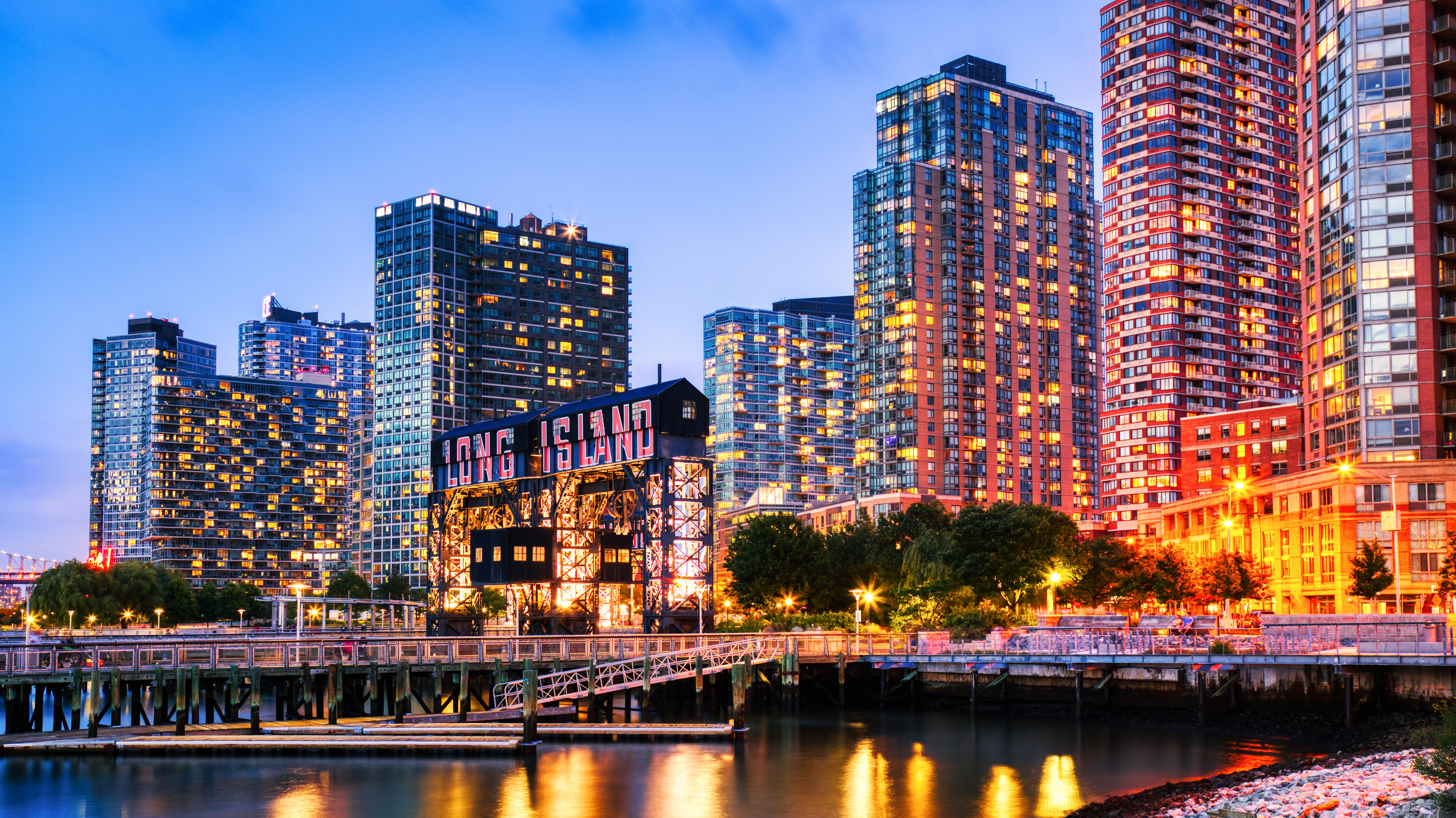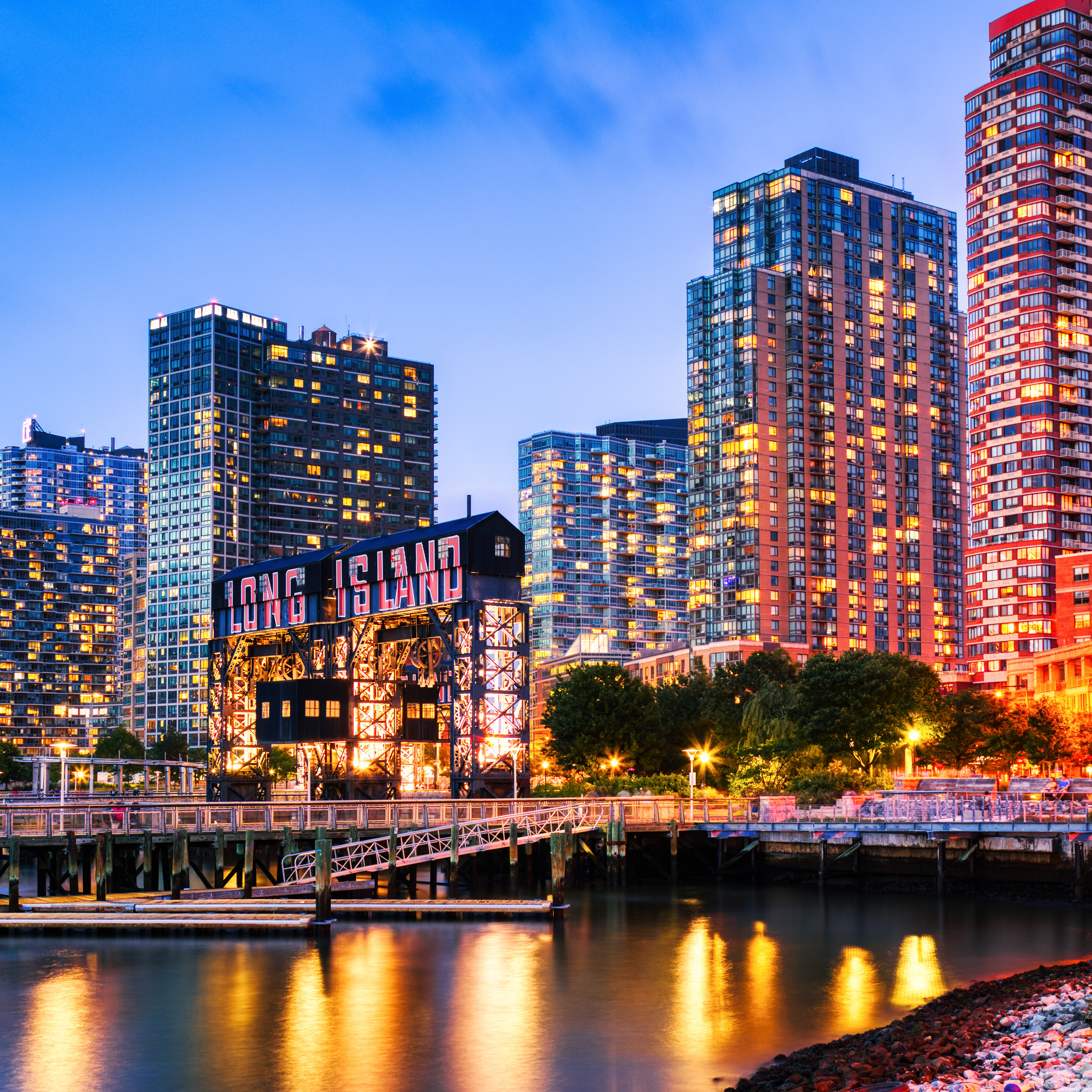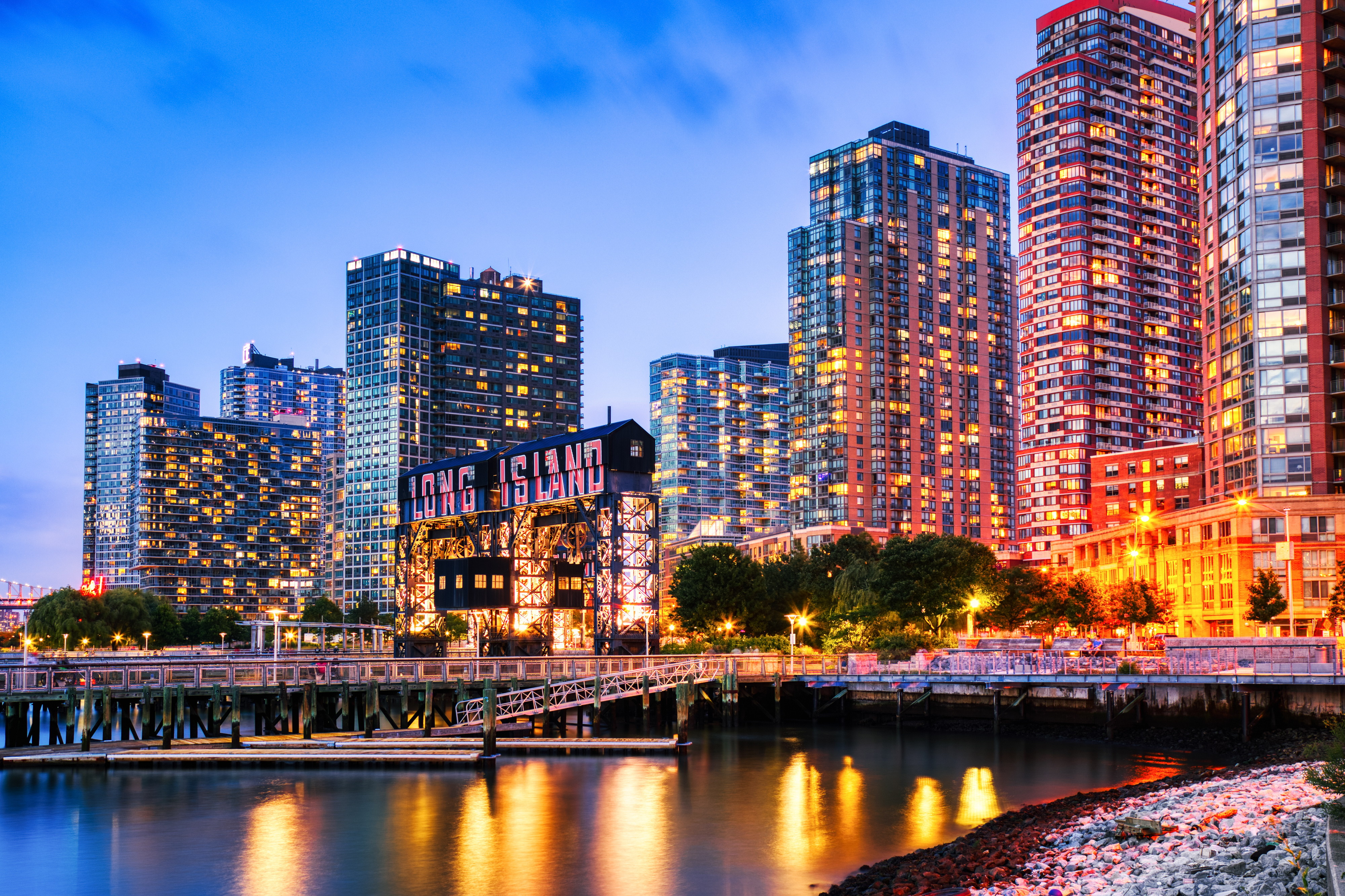Long Island City waterfront at dusk with high-rise multifamily buildings, 'Longs Island' sign, East River reflections, and New York City skyline in background.