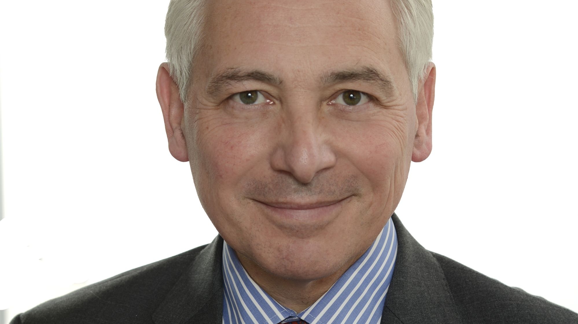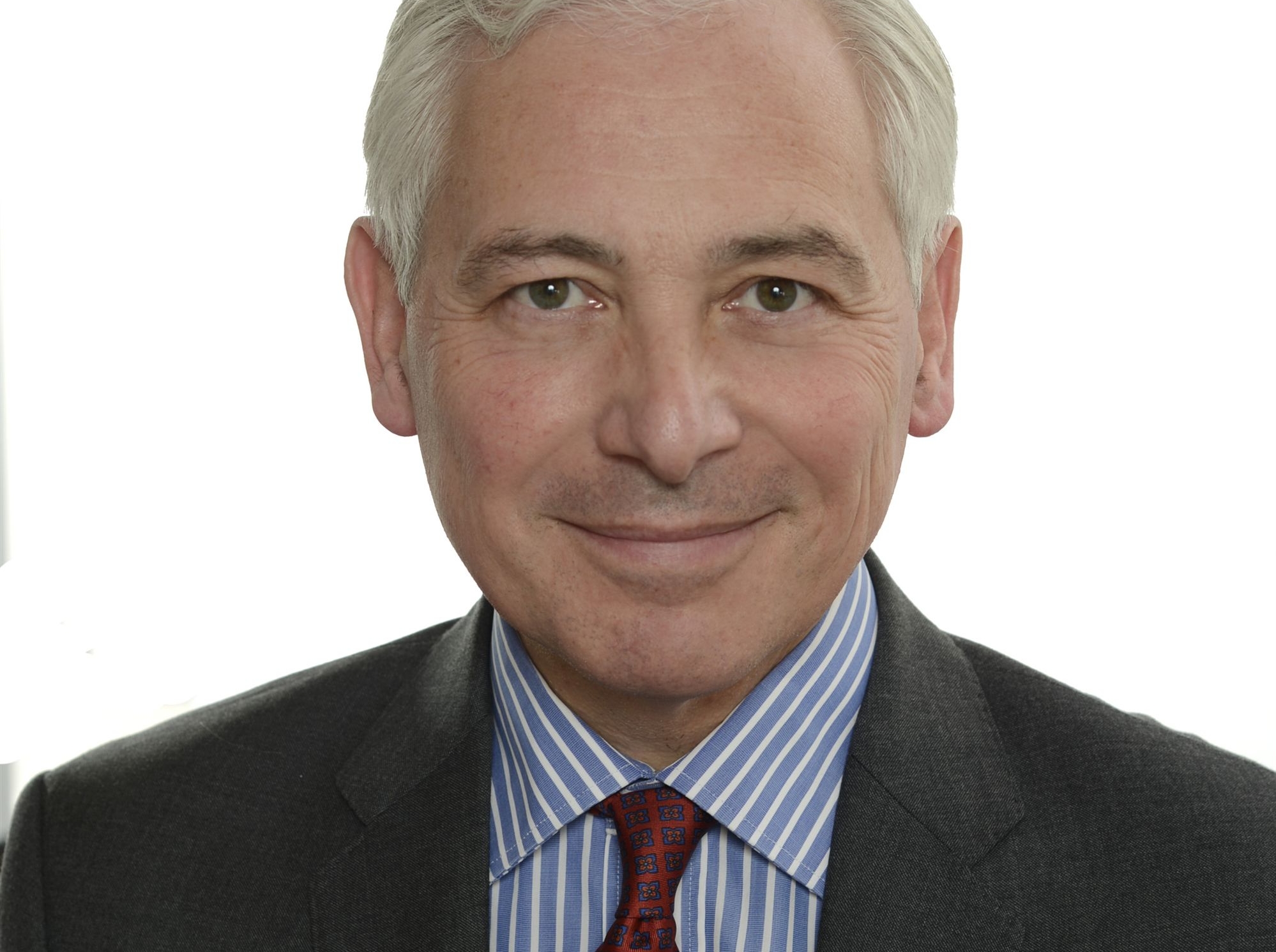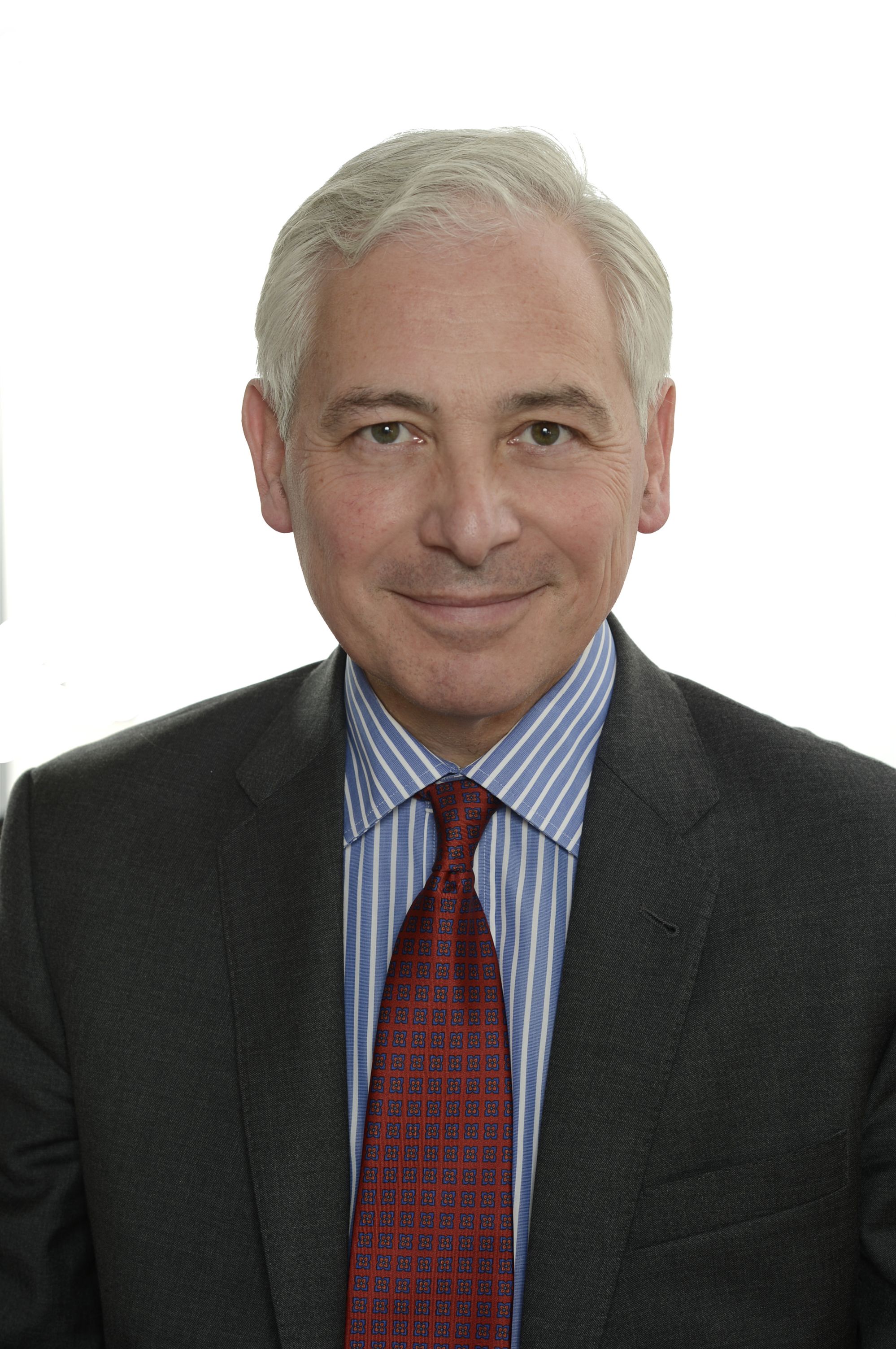 Portrait of a senior executive in a dark suit, striped shirt and patterned red tie on a white background