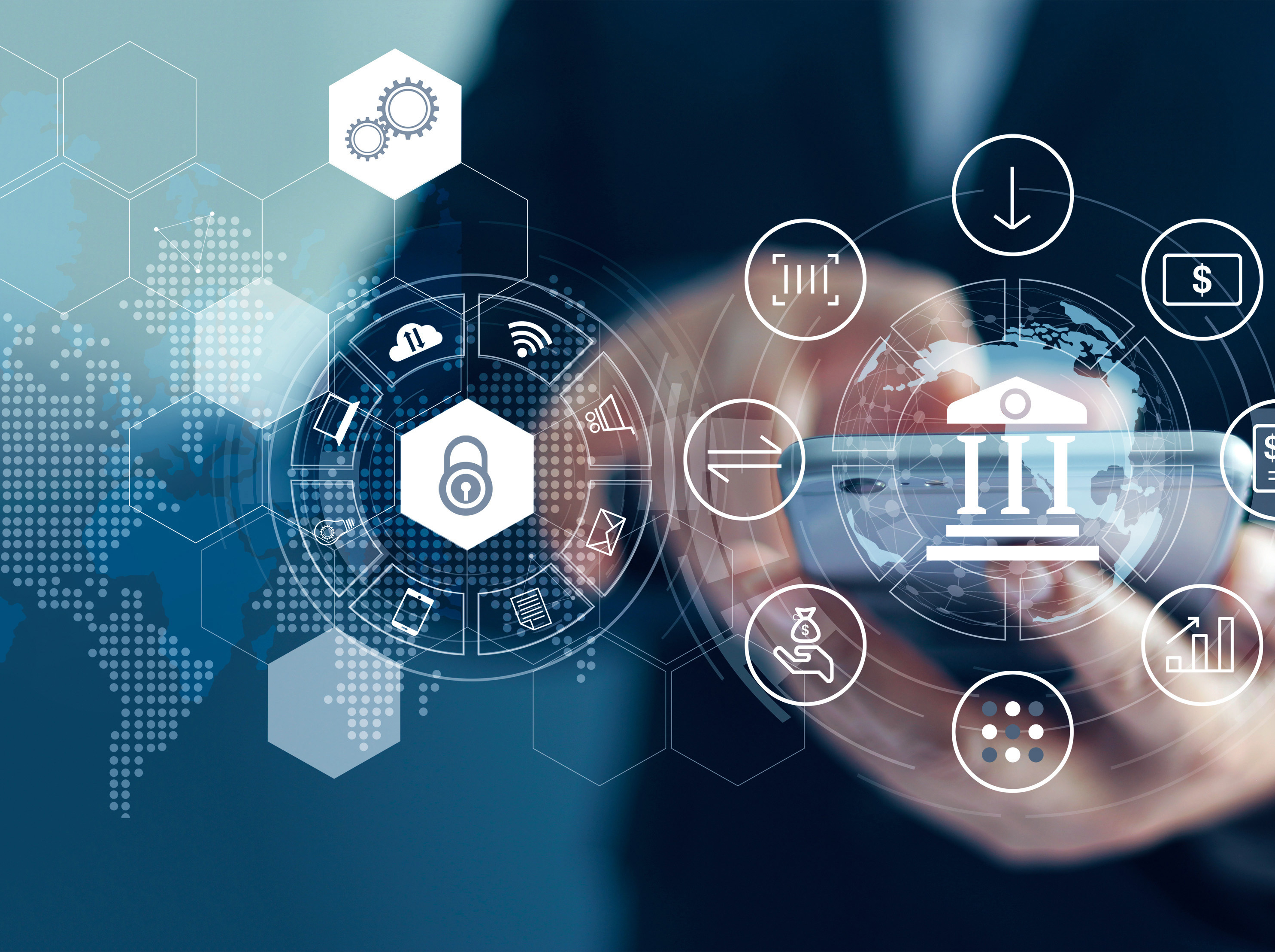 Hand holding smartphone displaying bank building icon with security icons like locks, shields, gears, globe on digital blue background.