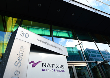 Entrance of Natixis headquarters at 30 Avenue Pierre Mendès France in Paris, featuring the Natixis logo and the slogan 'Beyond Banking' on a metal sign outside a modern glass building.