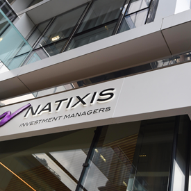 Facade of the Natixis Investment Managers office building, showcasing the corporate logo and modern glass architecture prominently at the entrance.