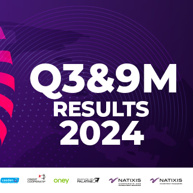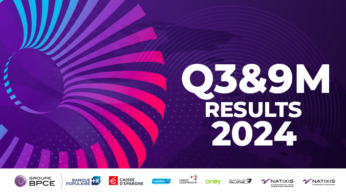 Graphic displaying Groupe BPCE Q3 and 9M 2024 results with logos of Banque Populaire, Caisse d'Epargne, Oney, and Natixis on purple and blue background.