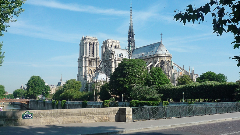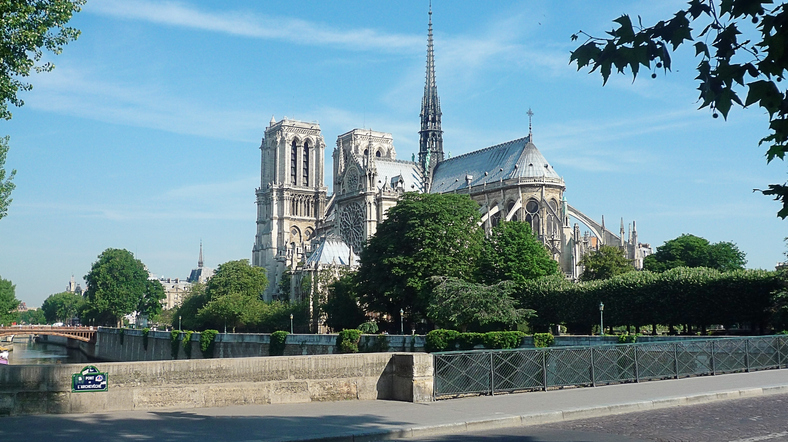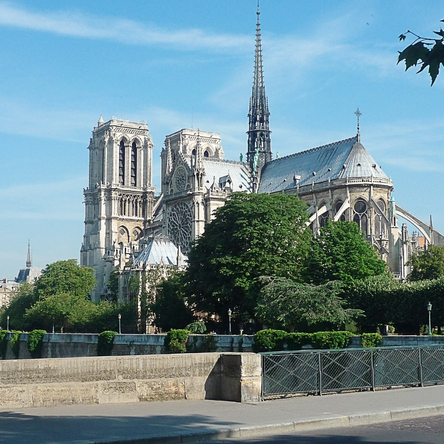 View of the Notre-Dame de Paris Cathedral showcasing its Gothic architecture, prominent towers, and spire as seen from across the Seine, surrounded by trees on a clear day.