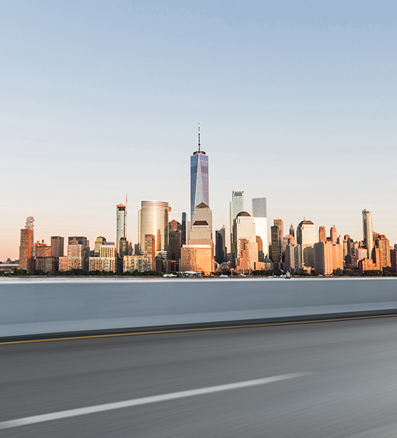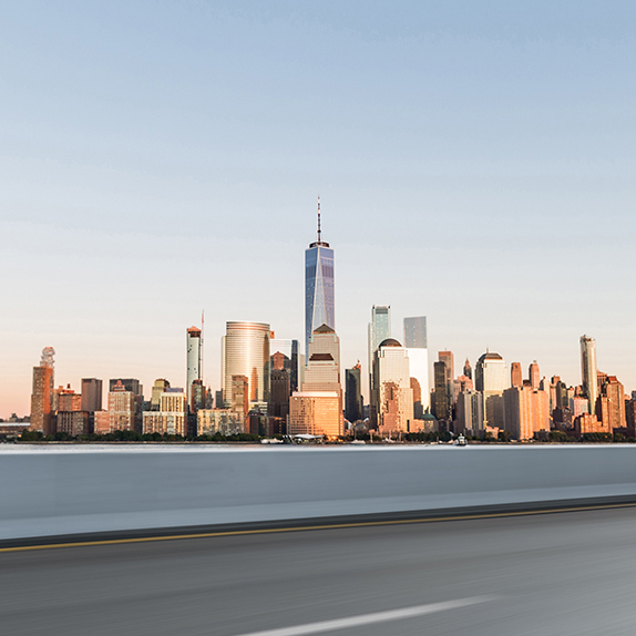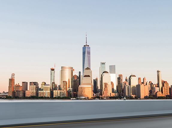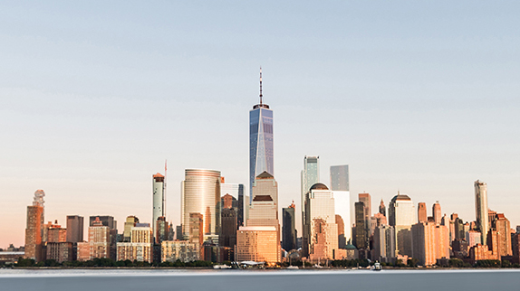 Panoramic view of the New York City skyline with One World Trade Center prominently visible, seen across the Hudson River under a clear sky.