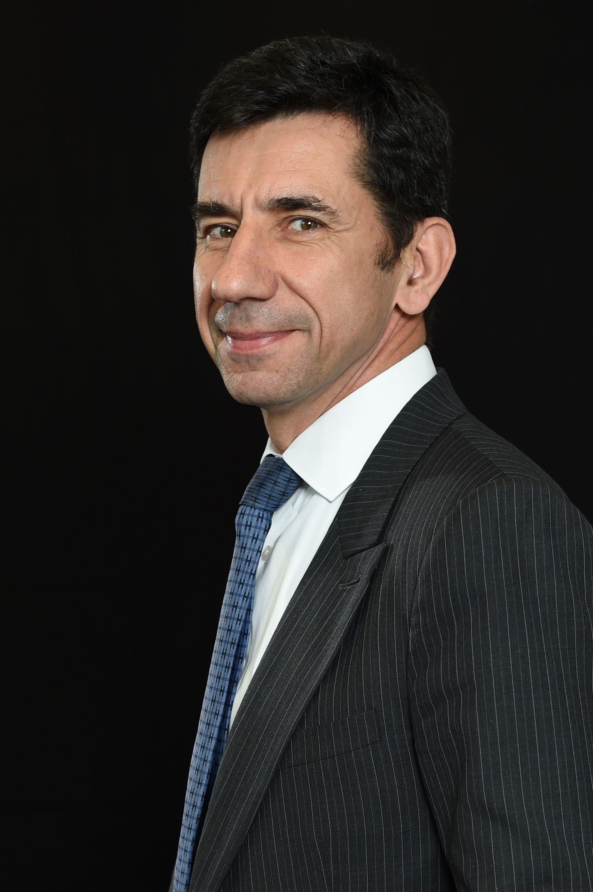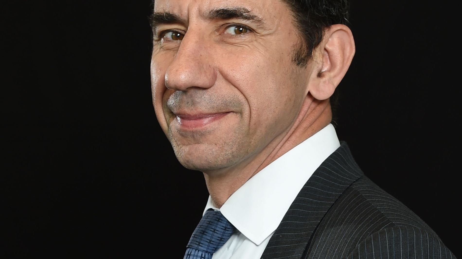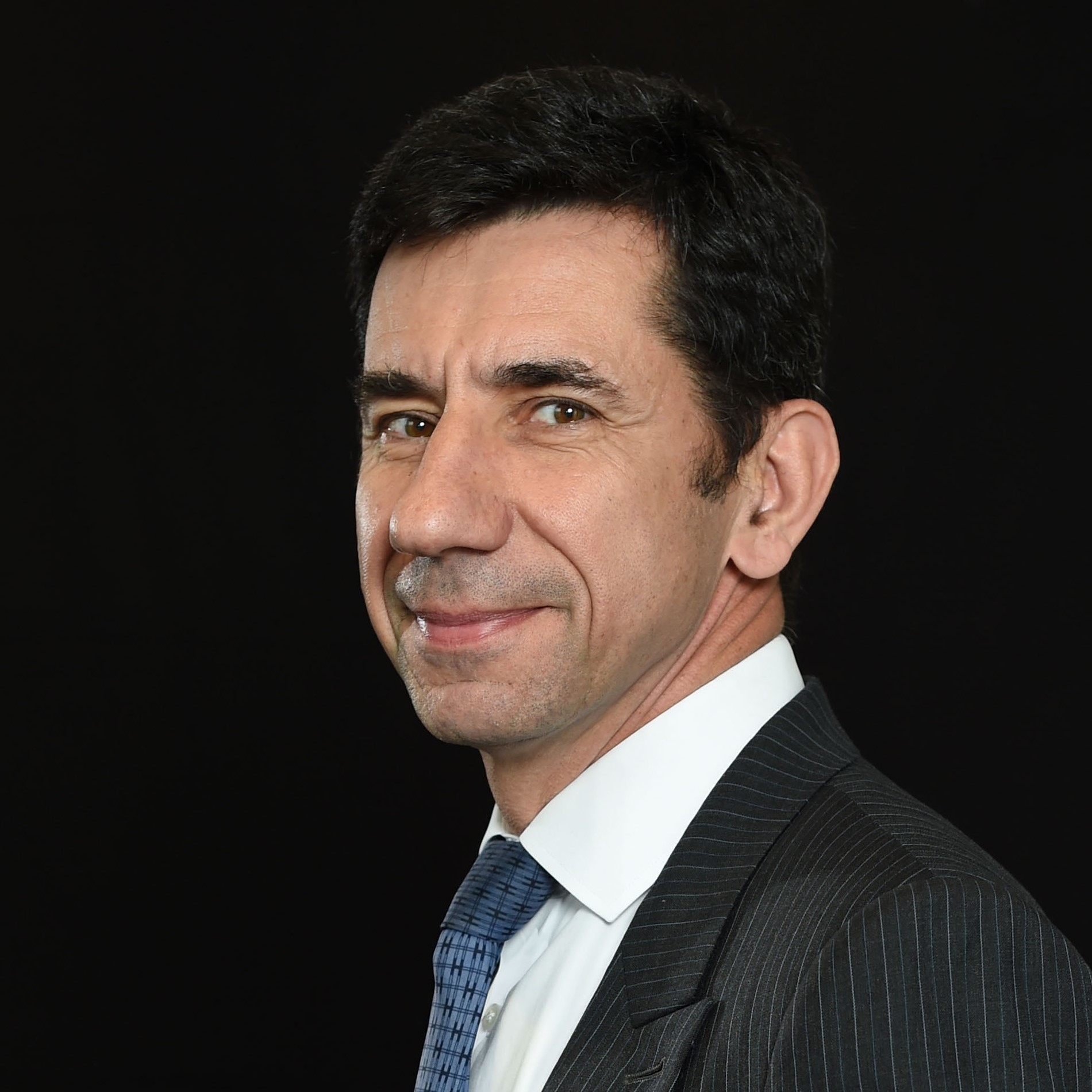 Portrait of a male executive in a dark pinstripe suit and tie on a black studio background
