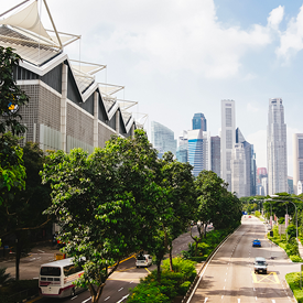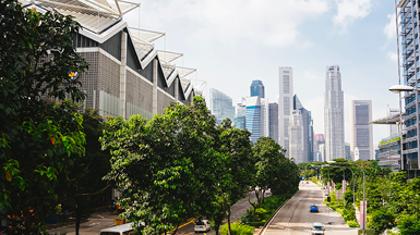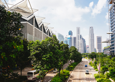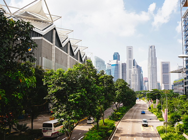 A city street in a modern business district is lined with mature green trees, with high-rise office buildings and skyscrapers visible in the background under a partly cloudy sky.