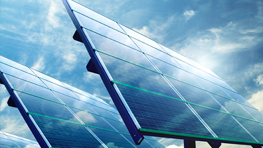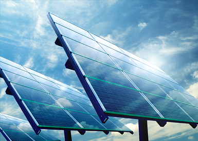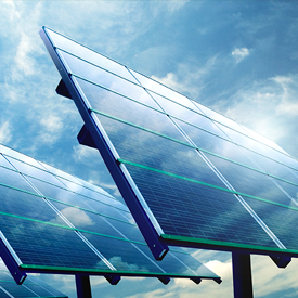 Close-up view of modern photovoltaic solar panels installed outdoors, angled toward the sky to capture sunlight for clean energy generation in renewable energy projects.