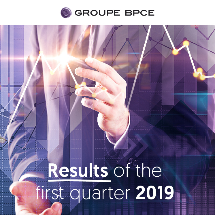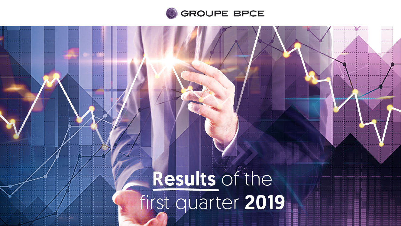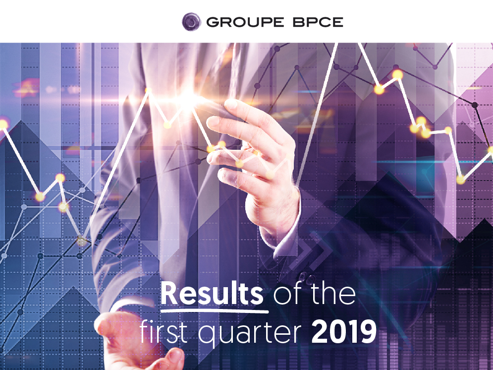 Visual presentation for Groupe BPCE's first quarter 2019 financial results, showing stylized graphs and business graphics representing financial analysis and performance.