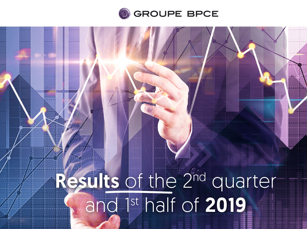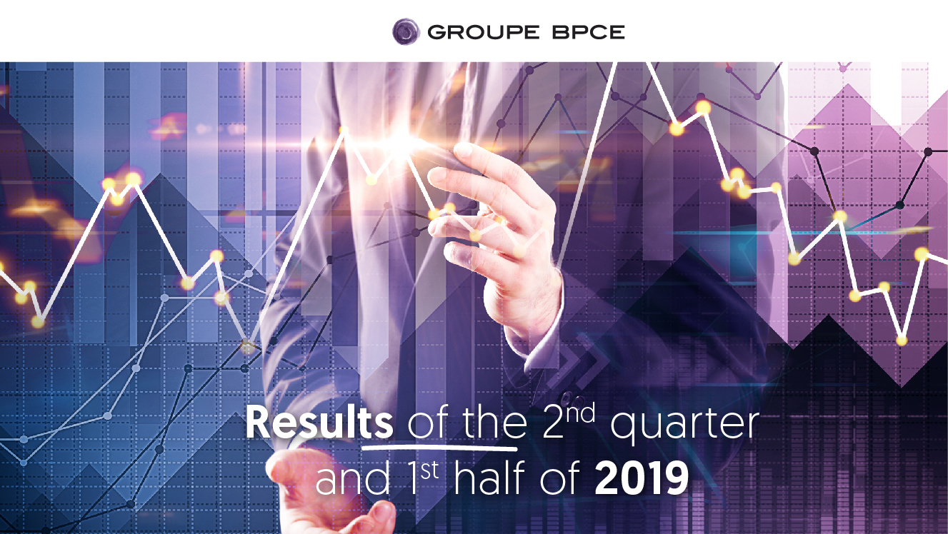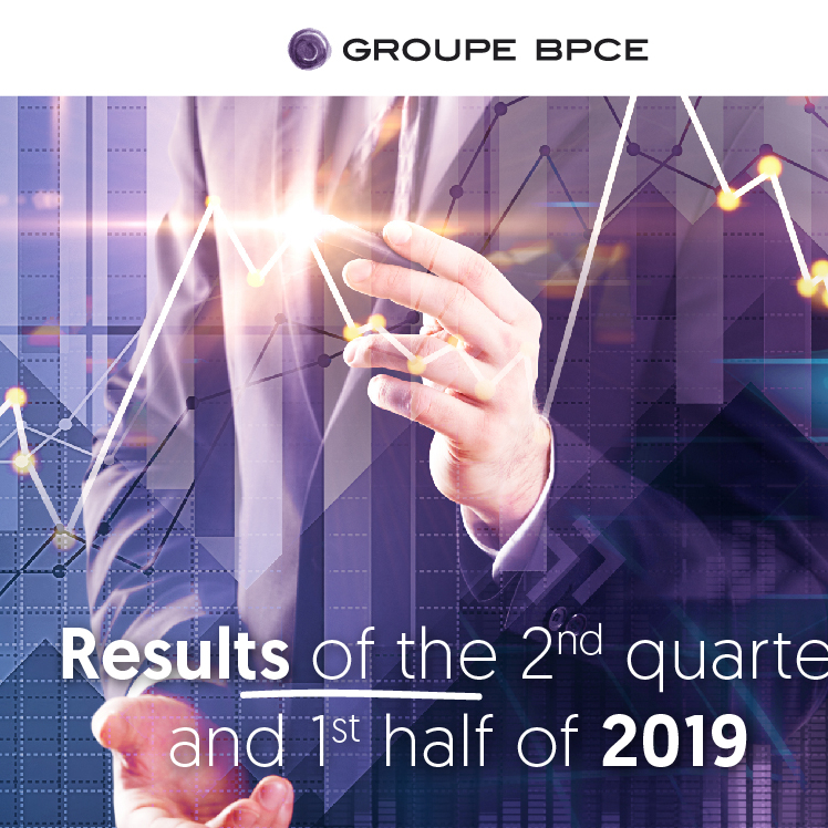 Infographic presenting Groupe BPCE's financial results for the second quarter and first half of 2019, featuring data visualization with animated financial charts.