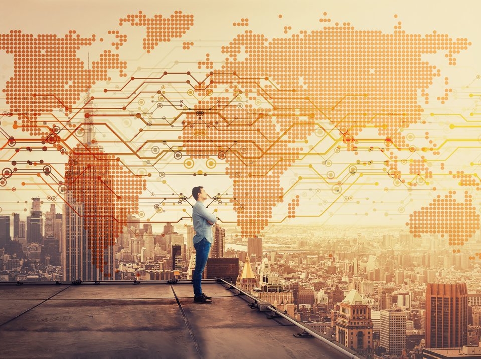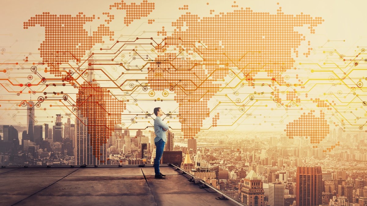 A man stands on a rooftop overlooking a city skyline, facing a large digital world map composed of orange dots and circuit-like connecting lines, representing global digital connectivity and technology.