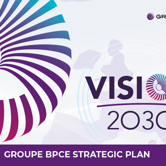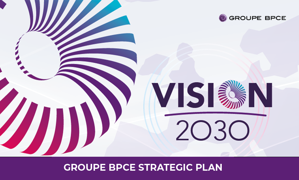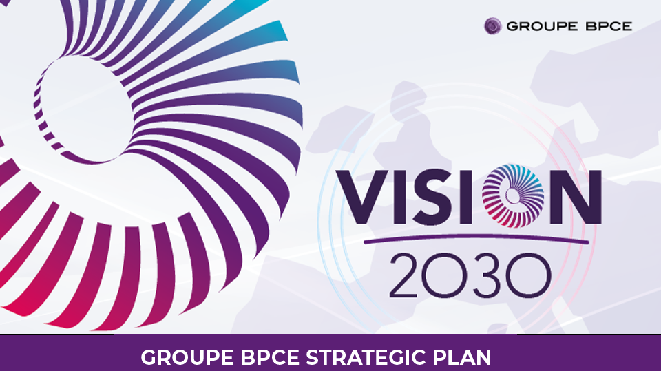 Graphic featuring the VISION 2030 logo with a spiral design, Groupe BPCE branding, and text 'GROUPE BPCE Strategic Plan' on a light background.