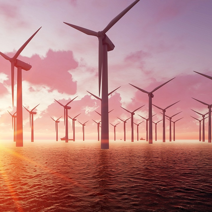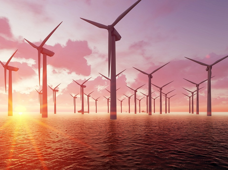Offshore wind farm at sunset illustrating large-scale clean energy production over open sea waters