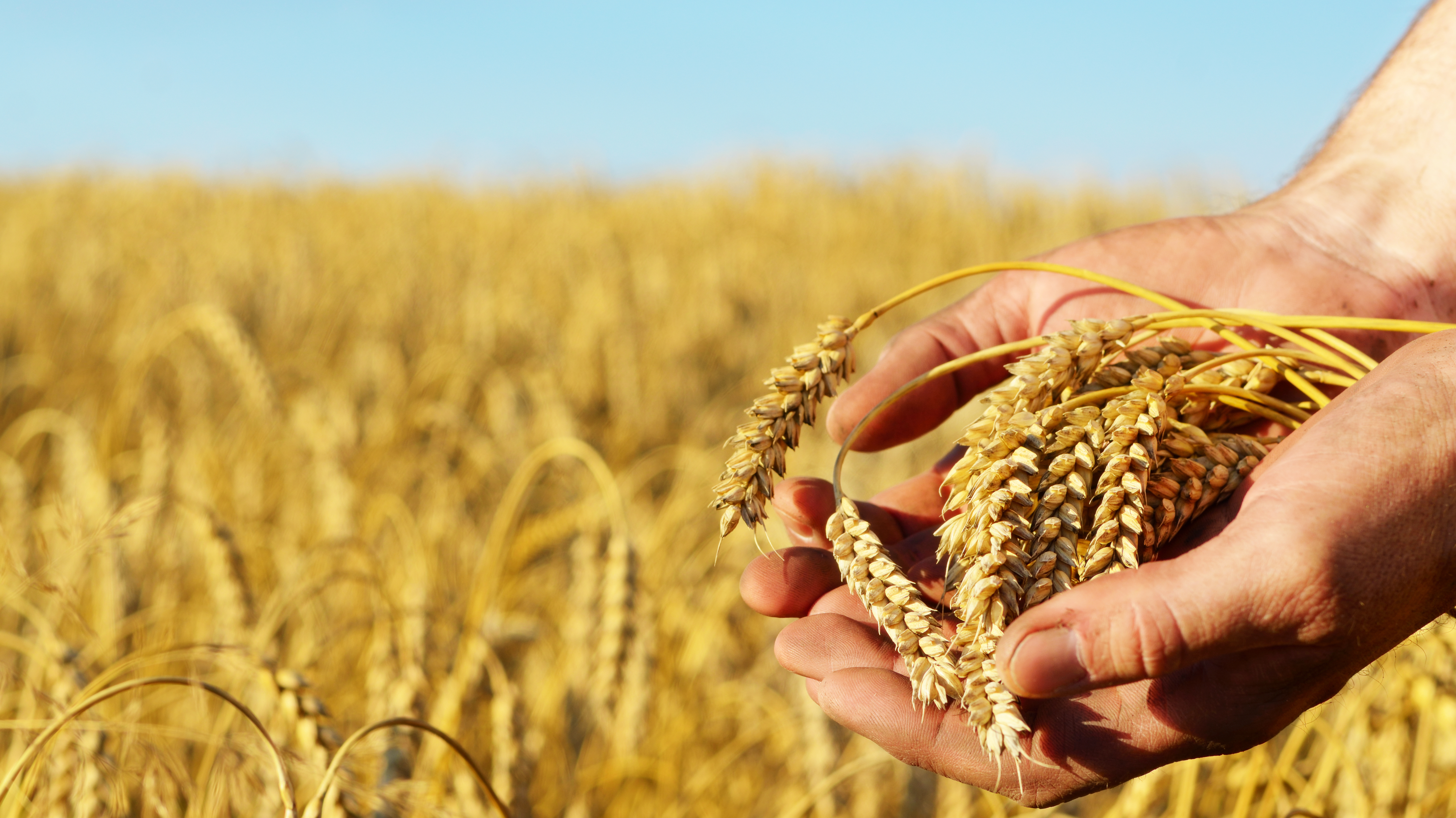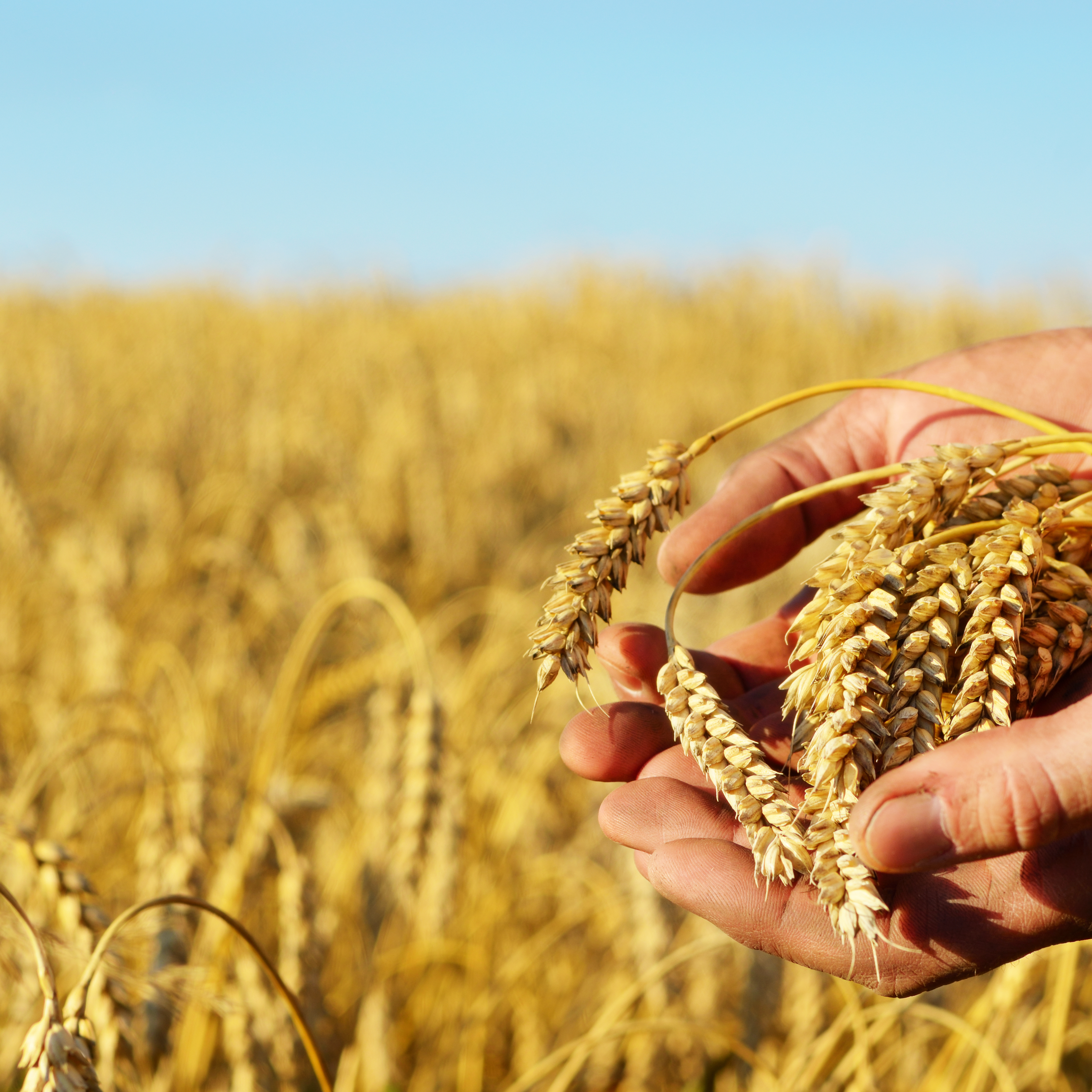 Close-up of hands holding ripe wheat ears in a golden wheat field under a clear blue sky, illustrating agricultural harvest and sustainable farming.