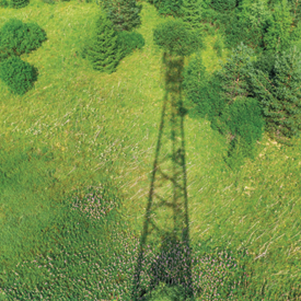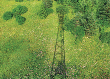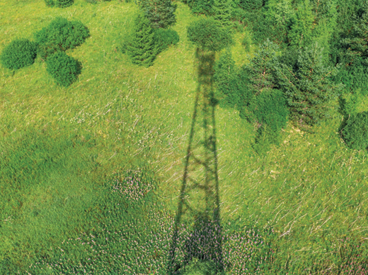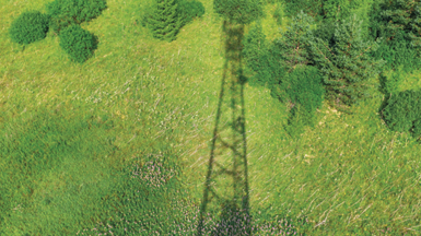 Shadow of a metal lattice tower cast over a green grassy field with scattered bushes and trees, viewed from above during daylight.