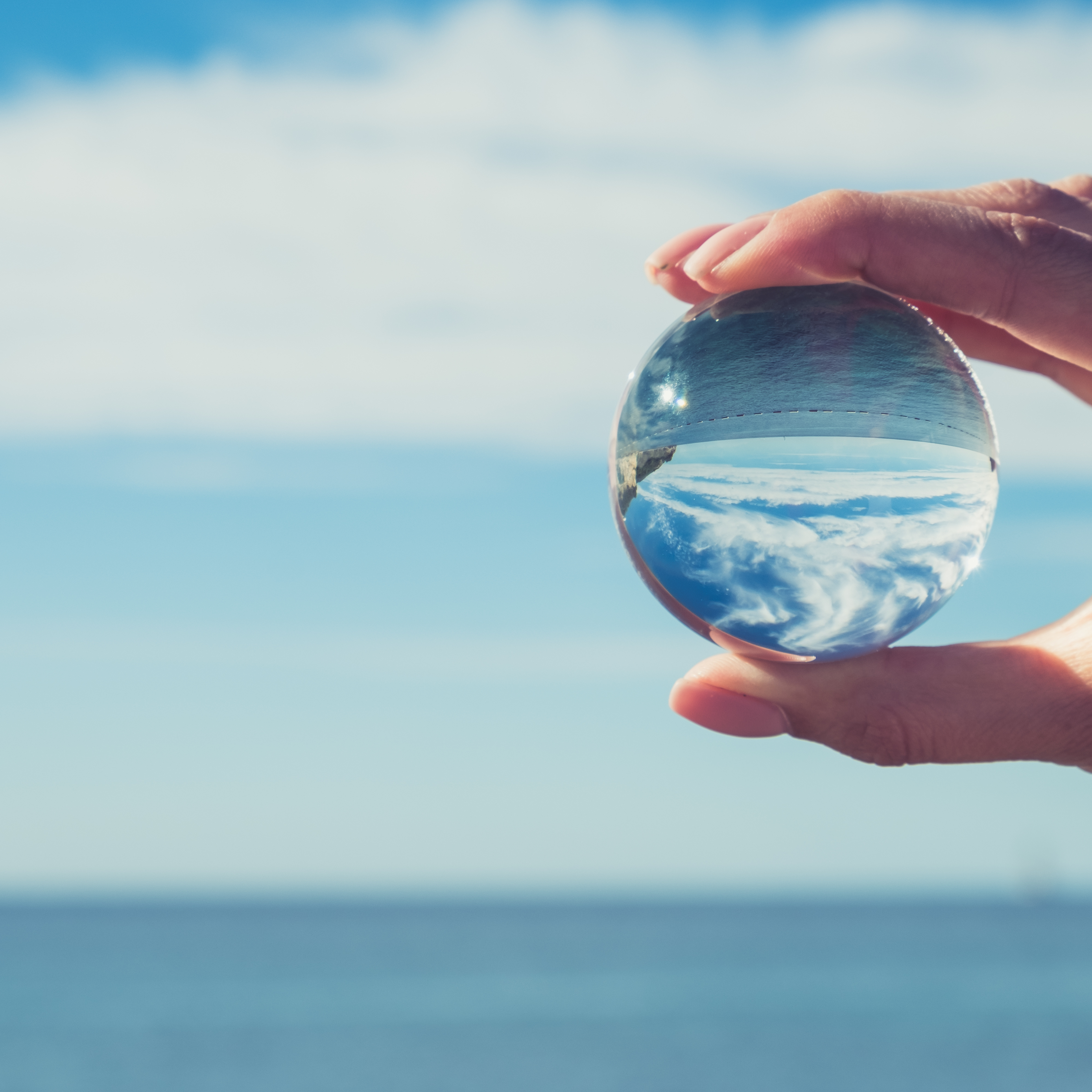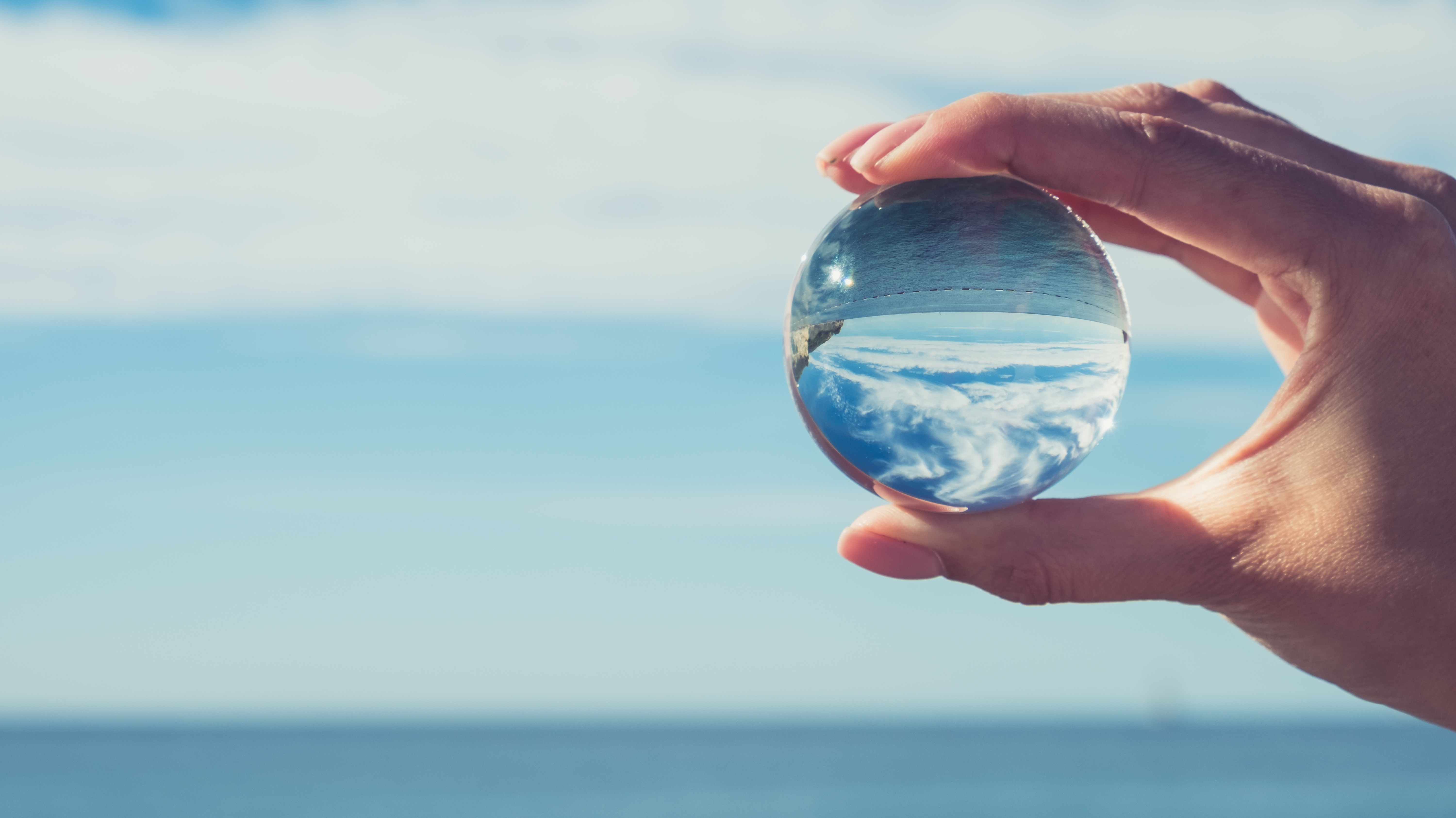 Hand holding a transparent glass sphere reflecting an inverted seascape and sky at the waterfront
