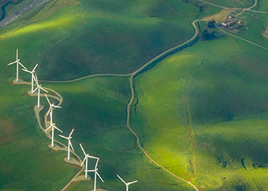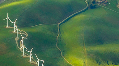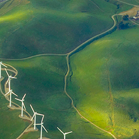 Aerial view of a wind farm with multiple wind turbines distributed across rolling green hills, illustrating renewable power generation in a rural landscape.